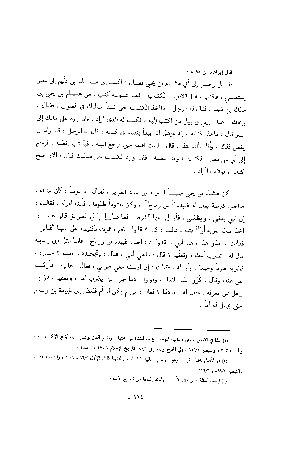 قال إبراهيم بن هشام: أقبل رجل إلى أبي هشام بن يحيى فقال: اكتب إلى مالك بن دلهم إلى مصر يستعملني، فكتب له الكتاب. فلما عنونه كتب: من هشام بن يحيى إلى مالك بن دلهم، فقال له الرجل: ما آخذ الكتاب حتى تبدأ بمالك في العنوان، فقال: ويحك! هذا سبيلي وسبيل من أكتب إليه، فكتب له الذي أراد. فلما ورد على مالك إلى مصر قال: ما هذا كتابه، إنه عودني أنه يبدأ بنفسه في كتابه، قال له الرجل: قد أراد أن يفعل ذلك، وأنا سألته هذا، قال: لست أقبله حتى ترجع إليه، فيكتب بخطه، فرجع إلى أبي من مصر، فكتب له وبدأ بنفسه. فلما ورد الكتاب على مالك قال: الآن صح كتابه، فولاه ما أراد.