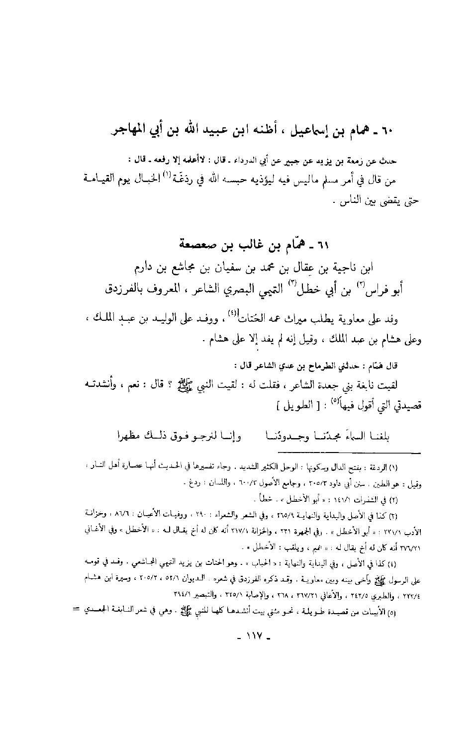 قال همام: حدثني الطرماح بن عدي الشاعر قال: لقيت نابغة بني جعدة الشاعر، فقلت له: لقيت النبي صَلَّى اللهُ عَلَيْهِ وَسَلَّمَ؟ قال: نعم، وأنشدته قصيدتي التي أقول فيها:
