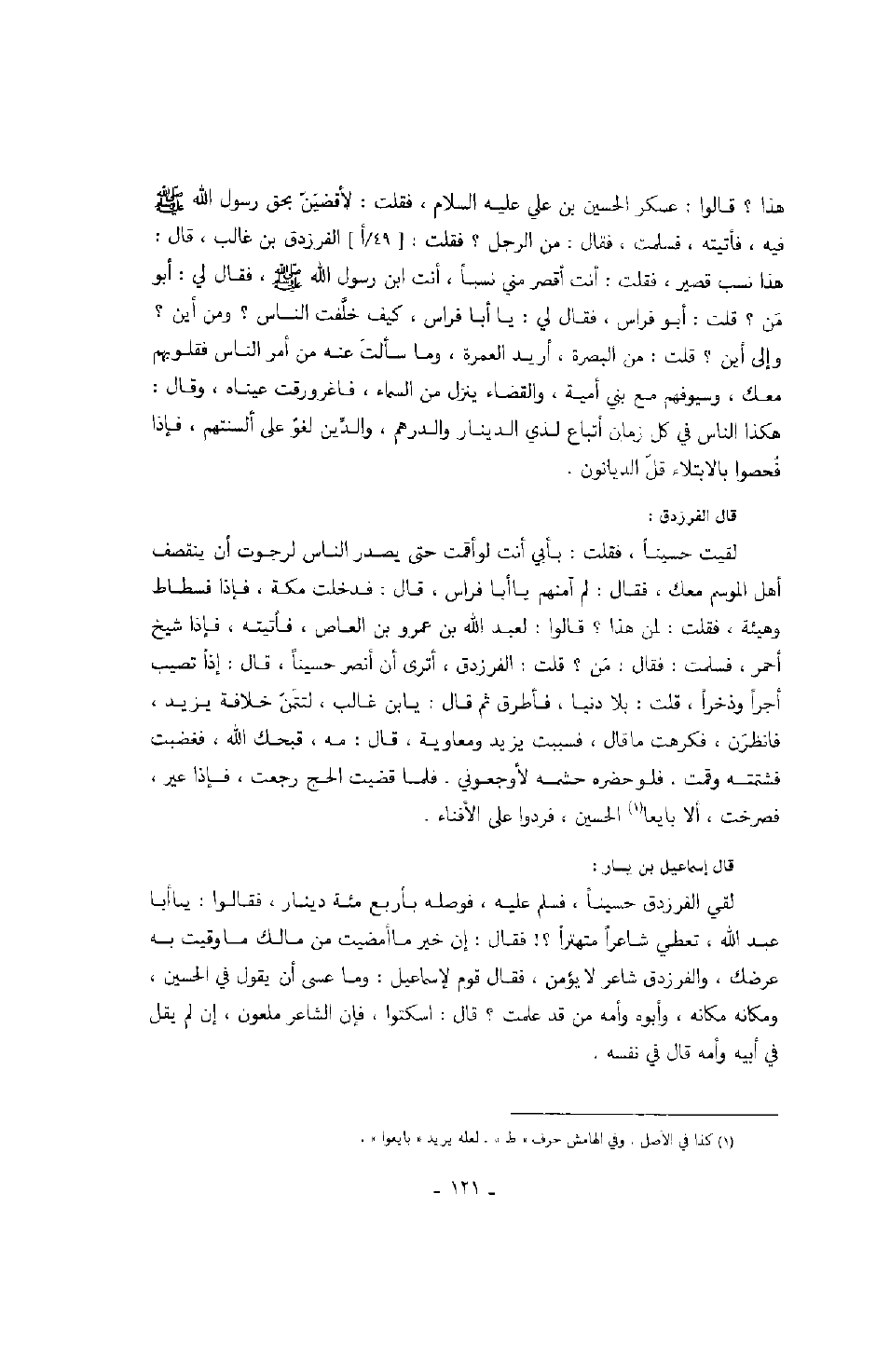 قال إسماعيل بن يسار: لقي الفرزدق حسيناً، فسلم عليه، فوصله بأربع مئة دينار، فقالوا: يا أبا عبد الله، تعطي شاعراً متهتراً؟! فقال: إن خير ما أمضيت من مالك ما وقيت به عرضك، والفرزدق شاعر لا يؤمن، فقال قوم لإسماعيل: وما عسى أن يقول في الحسين، ومكانه مكانه، وأبوه وأمه من قد علمت؟ قال: اسكتوا، فإن الشاعر ملعون، إن لم يقل في أبيه وأمه قال في نفسه.