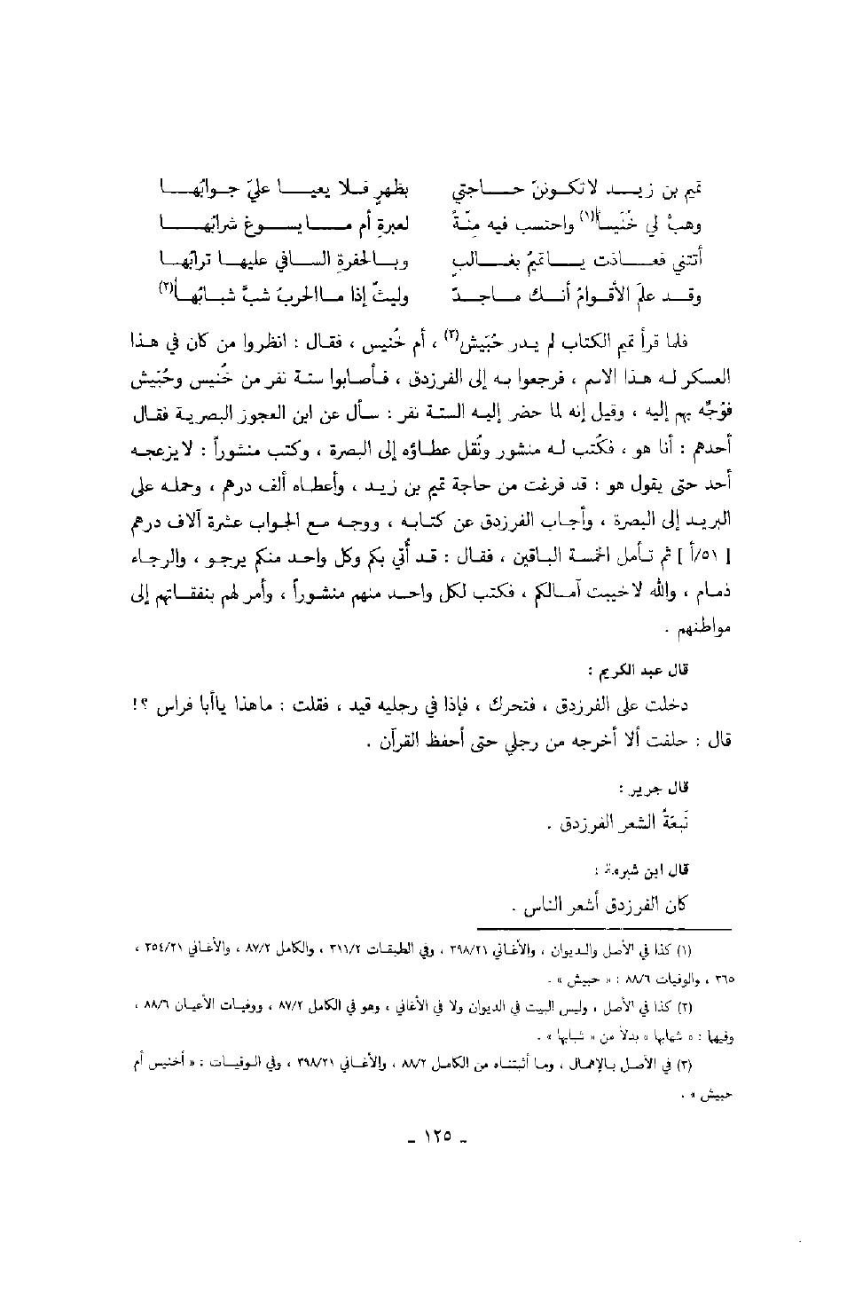 فلما قرأ تميم الكتاب لميدر حبيش، أم خنيس، فقال: انظروا من كان في هذا العسكر له هذا الاسم، فرجعوا به إلى الفرزدق، فأصابوا ستة نفر من خنيس وحبيش فوجه بهم إليه، وقيل إنه لما حضر إليه الستة نفر: سأل عن ابن العجوز البصرية فقال أحدهم: أنا هو، فكتب له منشور ونقل عطاؤه إلى البصرة، وكتب منشوراً: لا يزعجه أحد حتى يقول هو: قد فرغت من حاجة تميم بن زيد، وأعطاه ألف درهم، وحمله على البريد إلى البصرة، وأجاب الفرزدق عن كتابه، ووجه مع الجواب عشرة آلاف درهم ثم تأمل الخمسة الباقين، فقال: قد أتي بكم وكل واحد منكم يرجو، والرجاء ذمام، والله لا خيبت آمالكم، فكتب لكل واحد منهم منشوراً، وأمر لهم بنفقاتهم إلى مواطنهم.