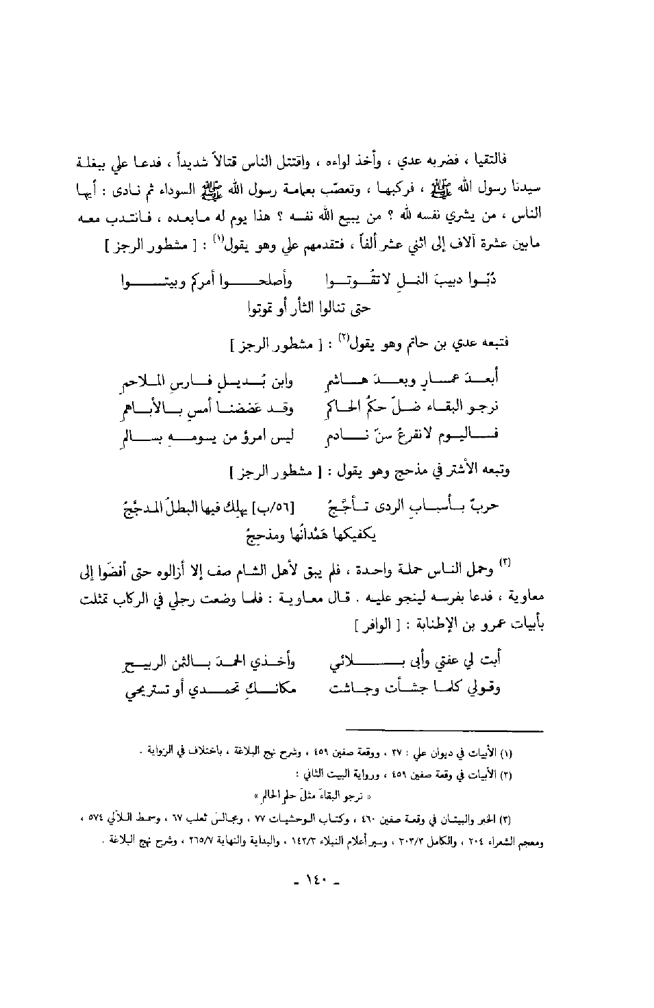 وحمل الناس حملة واحدة، فلم يبق لأهل الشام صف إلا أزالوه حتى أفضوا إلى معاوية، فدعا بفرسه لينجو عليه. قال معاوية: فلما وضعت رجلي في الركاب تمثلت بأبيات عمرو بن الإطنابة: