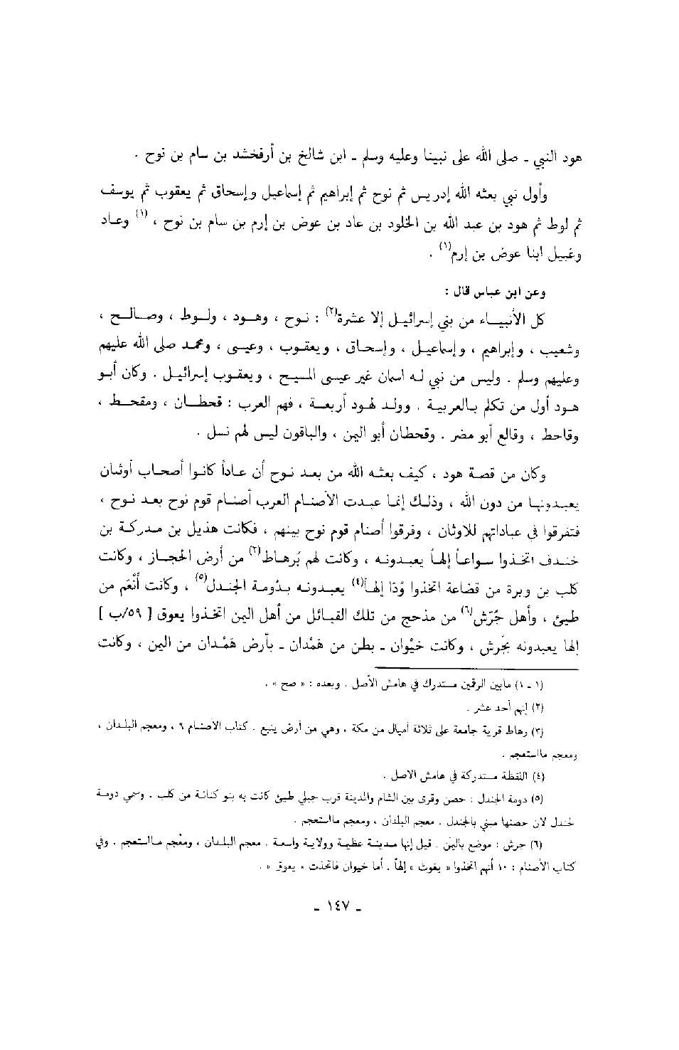 وأول نبي بعثه الله إدريس ثم نوح ثم إبراهيم ثم إسماعيل وإسحاق ثم يعقوب ثم يوسف ثم لوط ثم هود بن عبد الله بن الخلود بن عاد بن عوض بن إرم بن سام بن نوح، وعاد وغبيل ابنا عوض بن إرم.