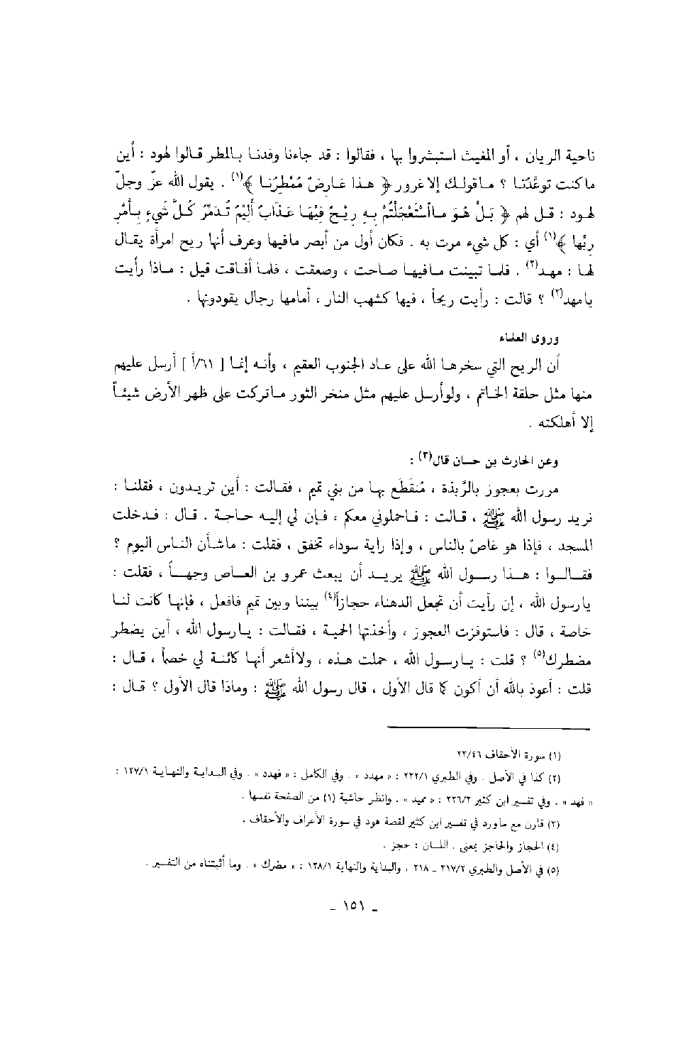 ناحية الريان، أو المغيث استبشروا بها، فقالوا: قد جاءنا وفدنا بالمطر قالوا لهود: أين ما كنت توعدنا؟ ما قولك إلا غرور " هذا عارض ممطرنا ". يقول الله عز وجل لهود: قل لهم " بل هو ما استعجلتم به ريح فيها عذاب أليم تدمر كل شيء بأمر ربها " أي: كل شيء مرت به. فكان أول من أبصر ما فيها وعرف أنها ريح امرأة يقال لها: مهد. فلما تبينت ما فيها صاحت، وصعقت، فلما أفاقت قيل: ماذا رأيت يا مهد؟ قالت: رأيت ريحاً، فيها كشهب النار، أمامها رجال يقودونها.