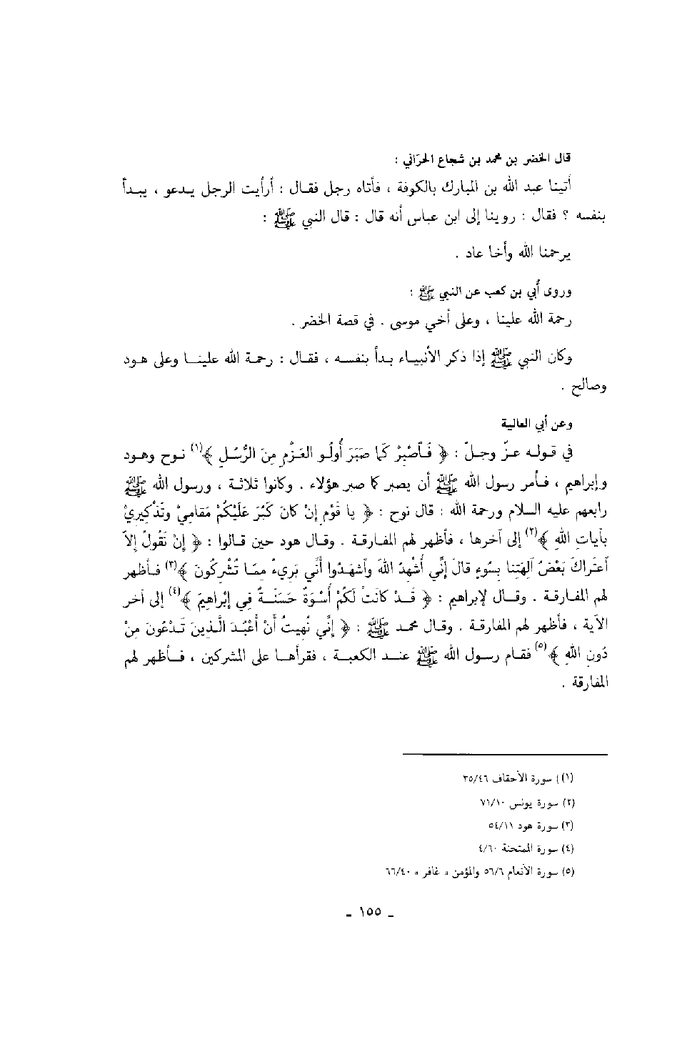 وعن أبي العالية في قوله عز وجل: " فاصبر كما صبر أولو العزم من الرسل " نوح وهود وإبراهيم، فأمر رسول الله صَلَّى اللهُ عَلَيْهِ وَسَلَّمَ أن يصبر كما صبر هؤلاء. وكانوا ثلاثة، ورسول الله صَلَّى اللهُ عَلَيْهِ وَسَلَّمَ رابعهم عليه السلام ورحمة الله: قال نوح: " يا قوم إن كان كبر عليكم مقامي وتذكيري بآيات الله " إلى آخرها، فأظهر لهم المفارقة. وقال هود حين قالوا: " إن تقول إلا اعتراك بعض آلهتنا بسوء قال إني أشهد الله واشهدوا أني بريء مما تشركون " فأظهر لهم المفارقة. وقال لإبراهيم: " قد كانت لكم أسوة حسنة في إبراهيم " إلى آخر الآية، فأظهر لهم المفارقة. وقال محمد صَلَّى اللهُ عَلَيْهِ وَسَلَّمَ: " إني نهيت أن أعبد الذين تدعون من دون الله " فقام رسول الله صَلَّى اللهُ عَلَيْهِ وَسَلَّمَ عند الكعبة، فقرأها على المشركين، فأظهر لهم المفارقة.