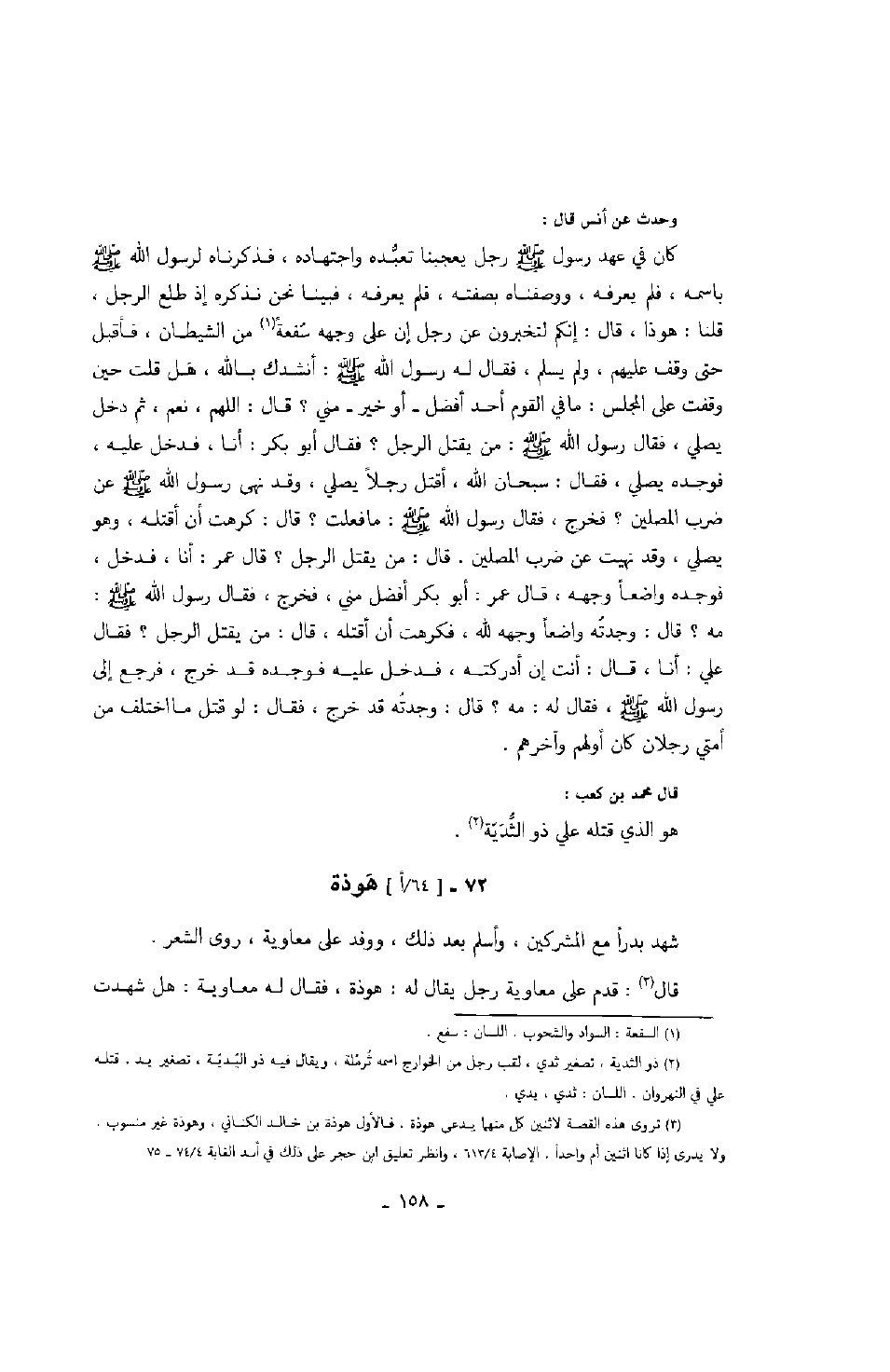 وحدث عن أنس قال: كان في عهد رسول الله صَلَّى اللهُ عَلَيْهِ وَسَلَّمَ رجل يعجبنا تعبده واجتهاده، فذكرناه لرسول الله صَلَّى اللهُ عَلَيْهِ وَسَلَّمَ باسمه، فلم يعرفه، ووصفناه بصفته، فلم يعرفه، فبينا نحن نذكره إذ طلع الرجل، قلنا: هوذا، قال: إنكم لتخبرون عن رجل إن على وجهه سفعة من الشيطان، فأقبل حتى وقف عليهم، ولم يسلم، فقال له رسول الله صَلَّى اللهُ عَلَيْهِ وَسَلَّمَ: أنشدك بالله، هل قلت حين وقفت على المجلس: ما في القوم أحد أفضل - أو خير - مني؟ قال: اللهم، نعم، ثم دخل يصلي، فقال رسول الله صَلَّى اللهُ عَلَيْهِ وَسَلَّمَ: من يقتل الرجل؟ فقال أبو بكر: أنا، فدخل عليه، فوجده يصلي، فقال: سبحان الله، أقتل رجلاً يصلي، وقد نهى رسول الله صلى الله عليهم وسلم عن ضرب المصلين؟ فخرج، فقال رسول الله صَلَّى اللهُ عَلَيْهِ وَسَلَّمَ: ما فعلت؟ قال: كرهت أن أقتله، وهو يصلي، وقد نهيت عن ضرب المصلين. قال: من يقتل الرجل؟ قال عمر: أنا، فدخل، فوجده واضعاً وجهه، قال عمر: أبو بكر أفضل مني، فخرج، فقال رسول الله صَلَّى اللهُ عَلَيْهِ وَسَلَّمَ: مه؟ قال: وجدته واضعاً وجهه لله، فكرهت أن أقتله، قال: من يقتل الرجل؟ فقال علي: أنا، قال: أنت إن أدركته، فدخل عليه فوجده قد خرج، فرجع إلى رسول الله صَلَّى اللهُ عَلَيْهِ وَسَلَّمَ، فقال له: مه؟ قال: وجدته قد خرج، فقال: لو قتل ما اختلف من أمتي رجلان كان أولهم وآخرهم.