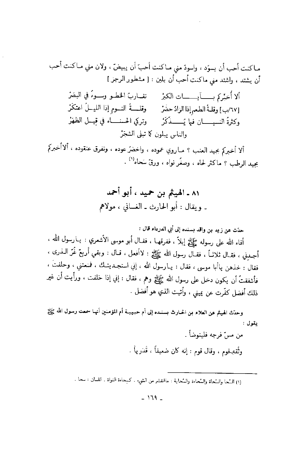 ألا أخبركم بجيد العنب؟ ما روي عموده، واخضر عوده، وتفرق عنقوده، ألا أخبركم بجيد الرطب؟ ما كثر لحاه، وصغر نواه، ورق سحاه