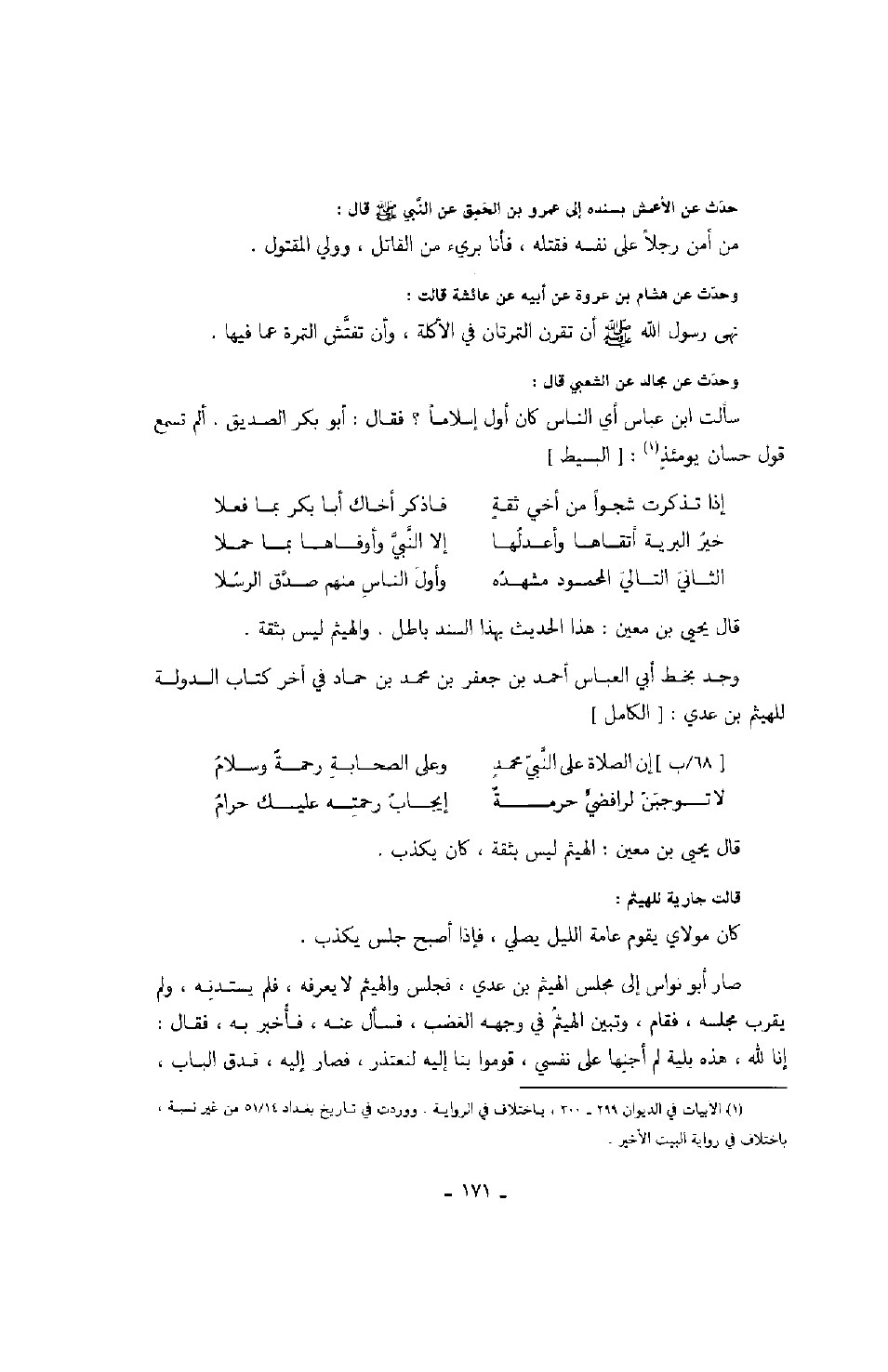 قال يحيى بن معين: هذا الحديث بهذا السند باطل. والهيثم ليس بثقة. وجد بخط أبي العباس أحمد بن جعفر بن محمد بن حماد في آخر كتاب الدولة للهيثم بن عدي: