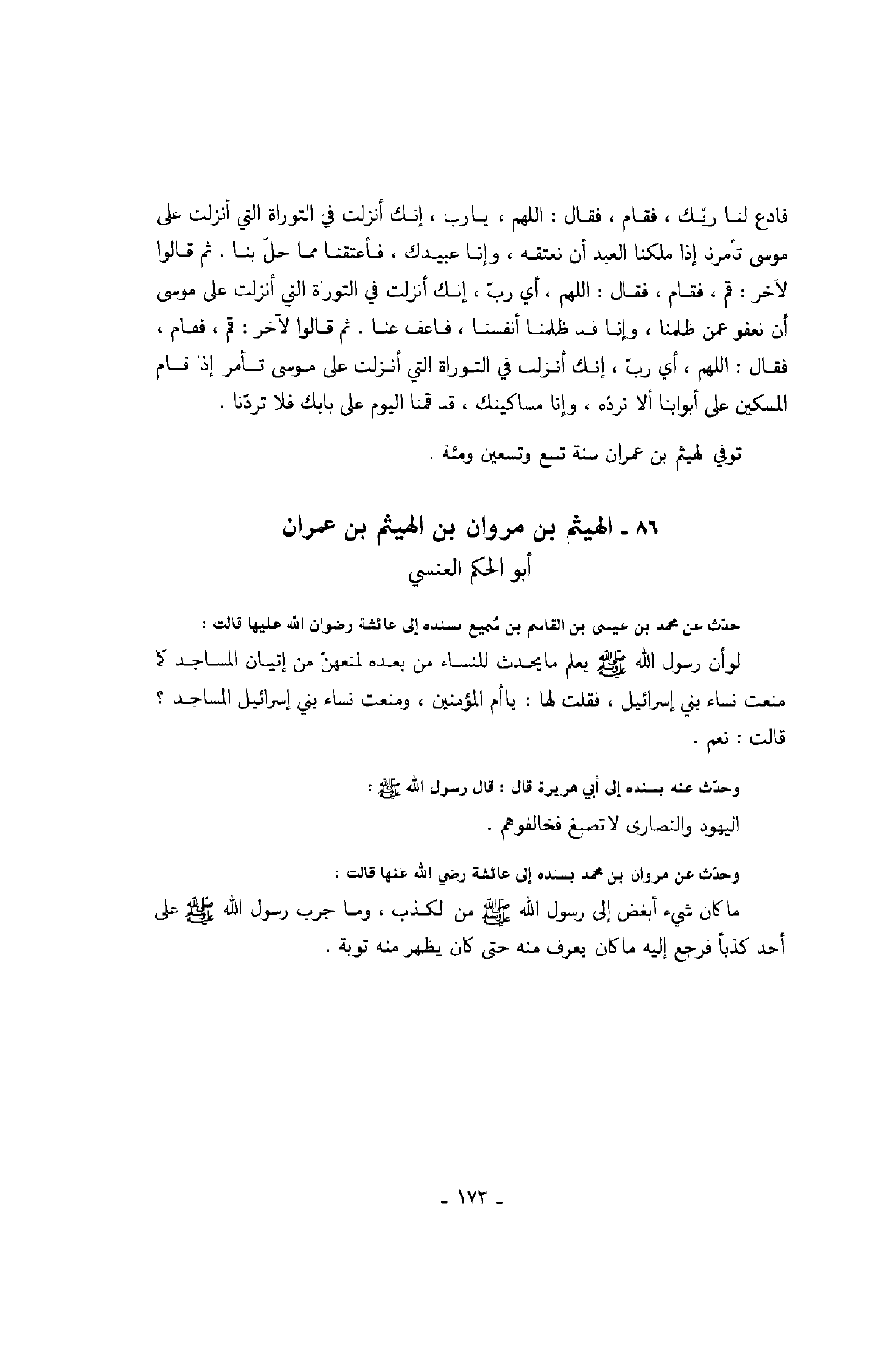 حدث عن محمد بن عيسى بن القاسم بن سميع بسنده إلى عائشة رضوان الله عليها قالت: لو أن رسول الله صَلَّى اللهُ عَلَيْهِ وَسَلَّمَ يعلم ما يحدث للنساء من بعده لمنعهن من إتيان المساجد كما منعت نساء بني إسرائيل، فقلت لها: يا أم المؤمنين، ومنعت نساء بني إسرائيل المساجد؟ قالت: نعم.