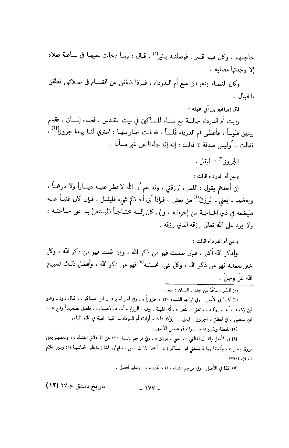 حاجبها، وكان فيه قصر، فوصلته بسير. قال: وما دخلت عليها في ساعة صلاة إلا وجدتها مصلية. وكان النساء يتعبدن مع أم الدرداء، فإذا ضعفن عن القيام في سلاتهن تعلقن بالحبال. قال إبراهيم بن أبي عبلة: رأيت أم الدرداء جالسة مع نساء المساكين في بيت المقدس، فجاء إنسان، فقسم بينهن فلوساً، فأعطى أم الدرداء فلساً، فقالت لجاريتها: اشتري لنا بهذا جروزاً، فقالت: أوليس صدقة؟ قالت: إنه إنما جاءنا عن غير مسألة.