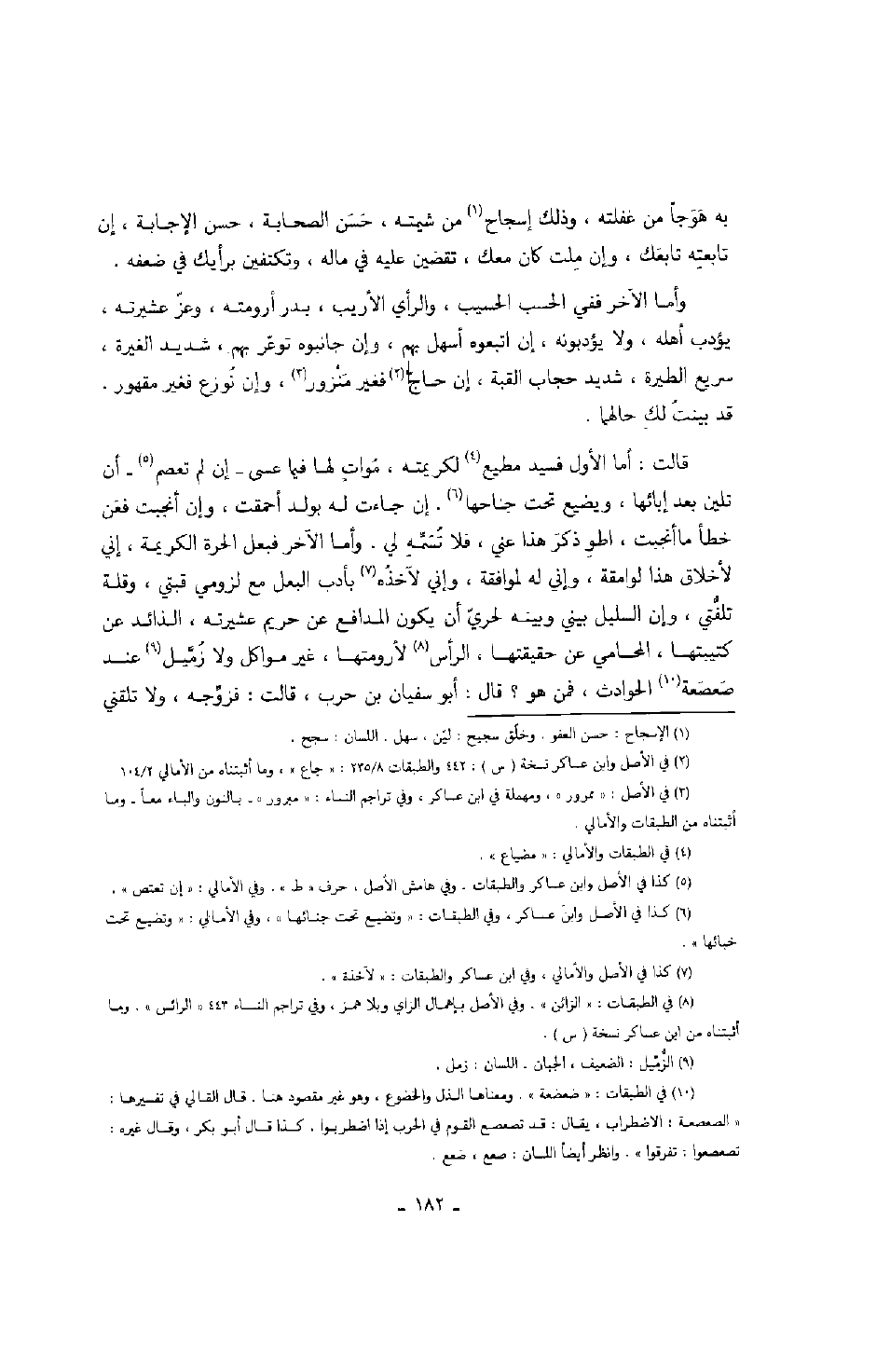 به هوجاً من غفلته، وذلك إسجاج من شيمته، حسن الصحابة، حسن الإجابة، إن تابعته تابعك، وإن ملت كان معك، تقضين عليه في ماله، وتكتفين برأيك في ضعفه. وأما الآخر ففي الحسب الحسيب، والرأي الأريب، بدار أرومته، وعز عشيرته، يؤدب أهله، ولا يؤدبونه، إن اتبعوه أسهل بهم، وإن جانبوه توعر بهم، شديد الغيرة، سريع الطيرة، شديد حجاب القبة، إن حاج فغير منزور، وإن نوزع فغير مقهور. قد بينت لك حالهما.