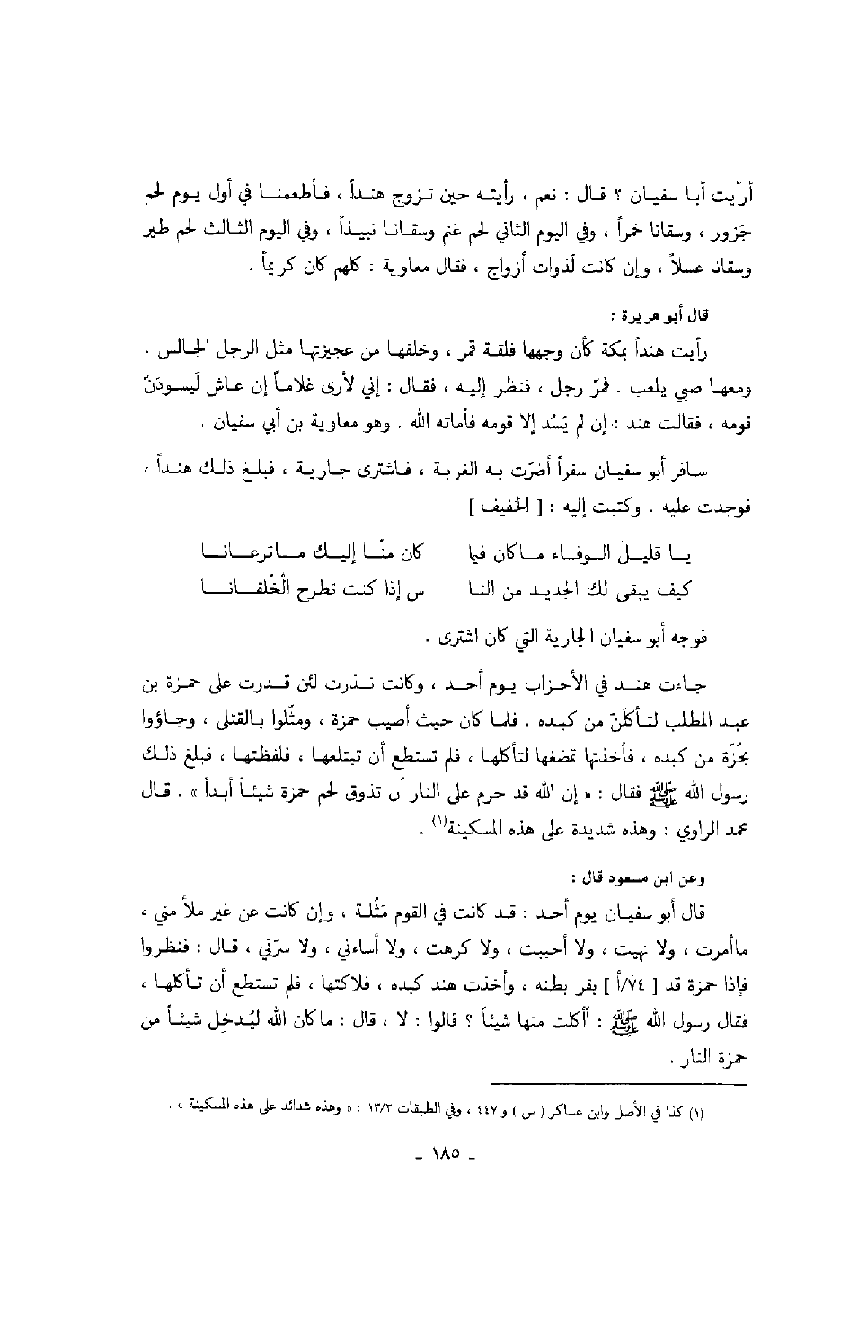 وعن ابن مسعود قال: قال أبو سفيان يوم أحد: قد كانت في القوم مثلة، وإن كانت عن غير ملأ مني، ما أمرت، ولا نهيت، ولا أحببت، ولا كرهت، ولا أساءني، ولا سرني، قال: فنظروا فإذا خمزة قد بقر بطنه، وأخذت هند كبده، فلاكتها، فلم تستطع أن تأكلها، فقال رسول الله صَلَّى اللهُ عَلَيْهِ وَسَلَّمَ: أأكلت منها شيئاً؟ قالوا: لا، قال: ما كان الله ليدخل شيئاً من حمزة النار.