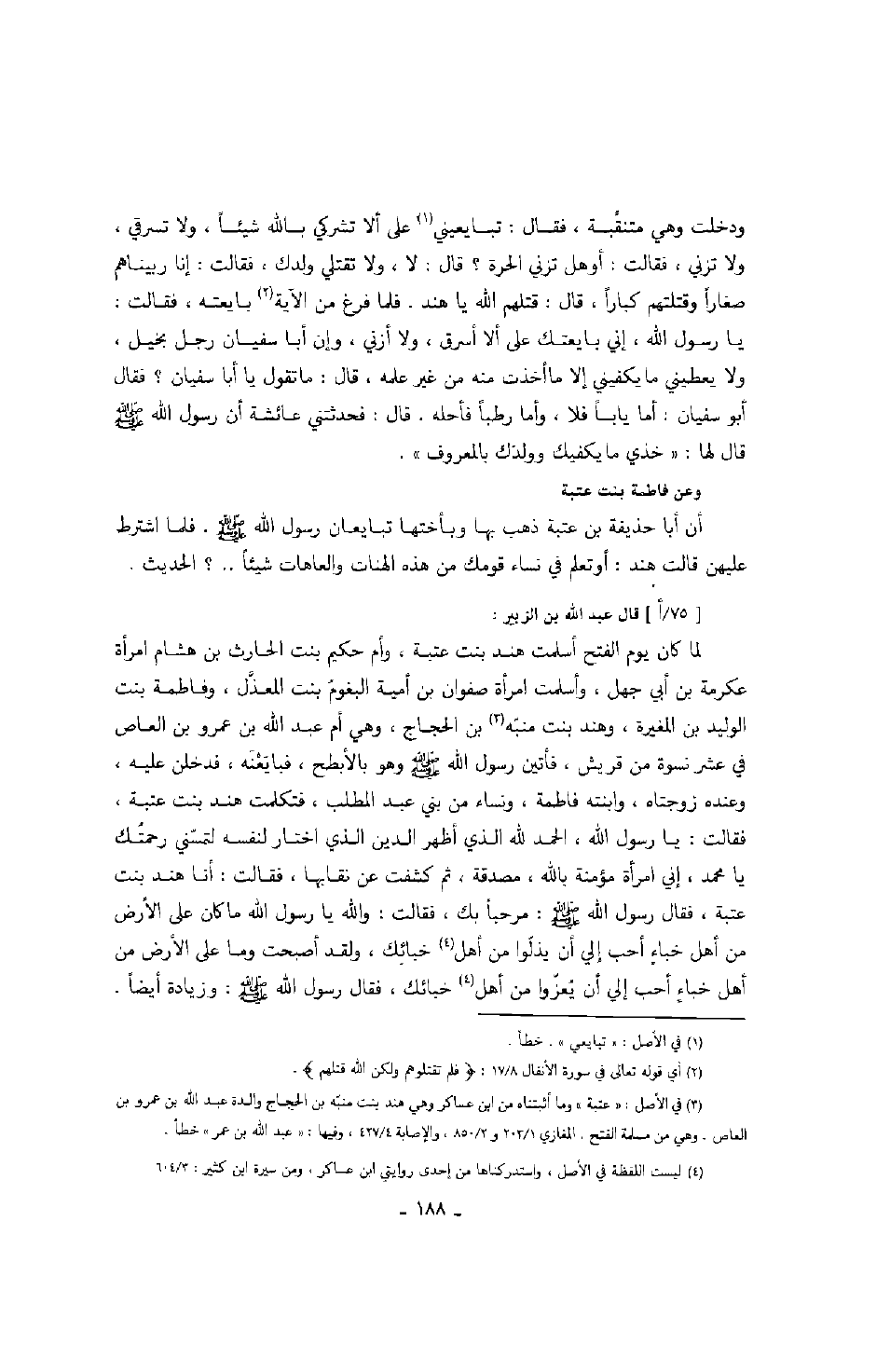 وعن فاطمة بنت عتبة، أن أبا حذيفة بن عتبة ذهب بها وبأختها تبايعان رسول الله صَلَّى اللهُ عَلَيْهِ وَسَلَّمَ. فلما اشترط عليهن قالت هند: أو تعلم في نساء قومك من هذه الهنات والعاهات شيئاً..؟؟ الحديث.