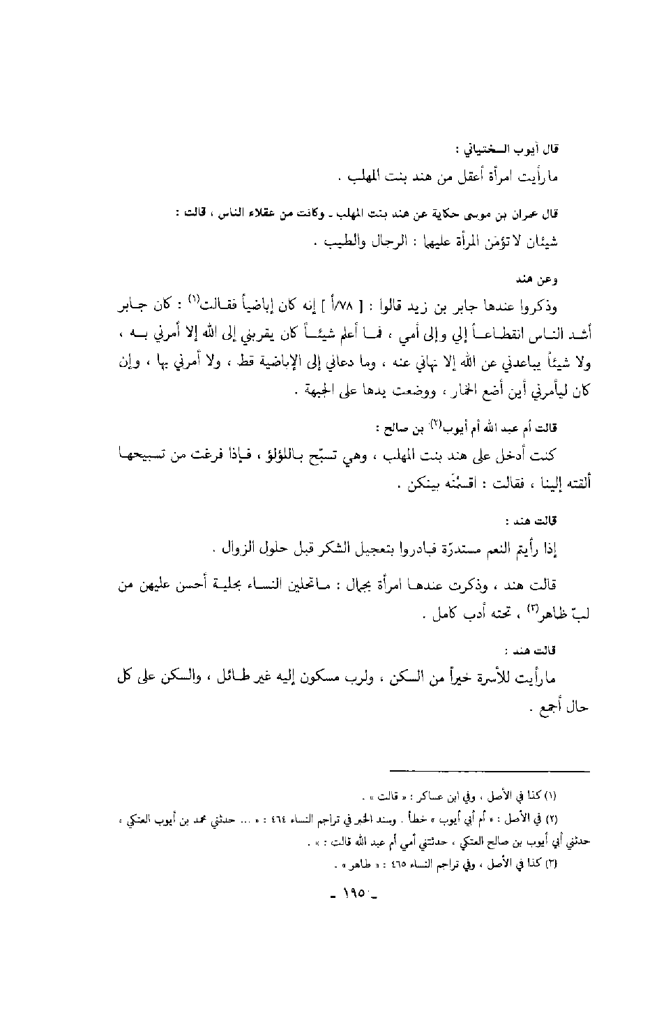 وعن هند، وذكروا عندها جابر بن زيد قالوا: إنه كان إباضياً فقالت: كان جابر أشد الناس انقطاعاً إلي وإلى أمي، فما أعلم شيئاً كان يقربني إلى الله إلا أمرني به، ولا شيئاً يباعدني عن الله إلا نهاني عنه، وما دعاني إلى الإباضية قط، ولا أمرني بها، وإن كان ليأمرني أين أضع الخمار، ووضعت يدها على الجبهة.