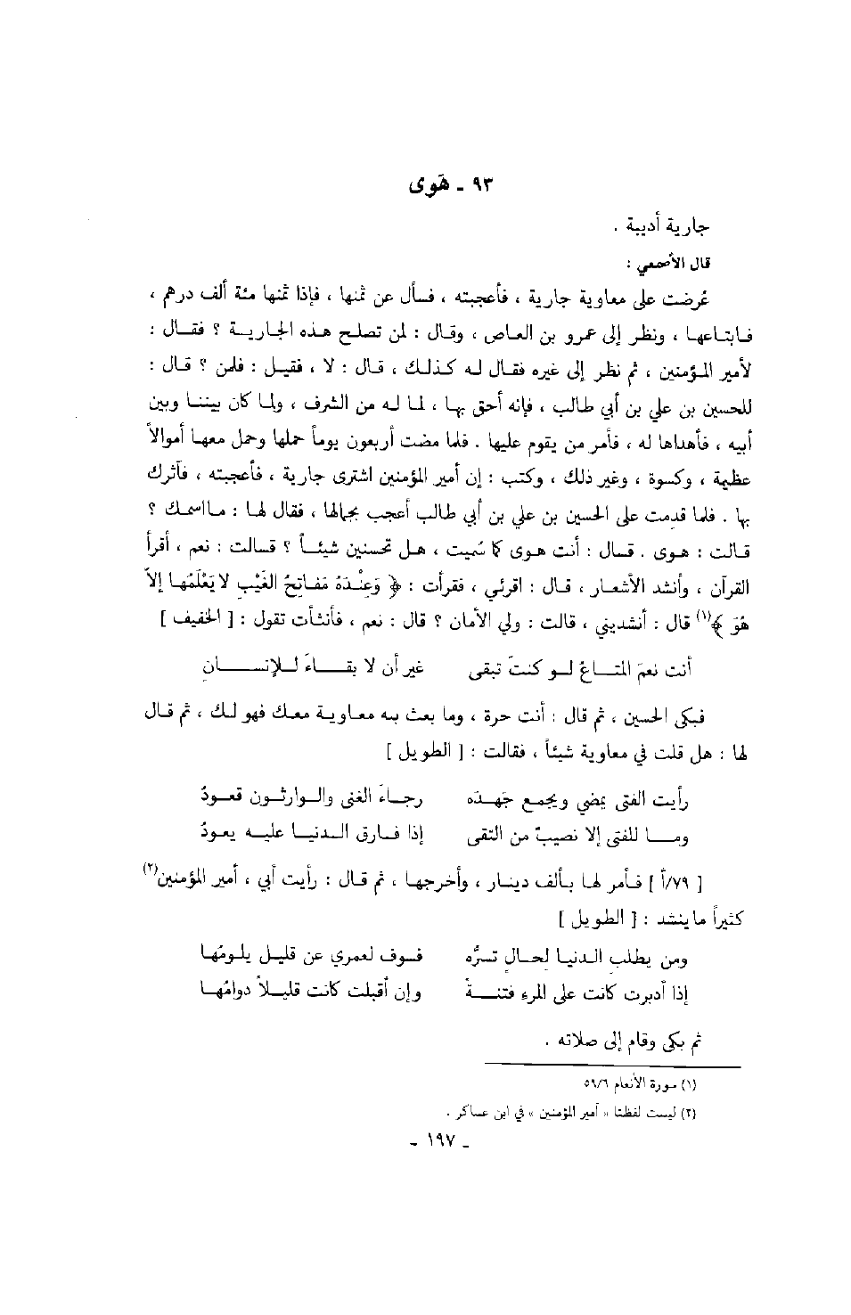 قال الأصمعي: عرضت على معاوية جارية، فأعجبته، فسأل عن ثمنها، فإذا ثمنها مئة ألف درهم، فابتاعها، ونظر إلى عمرو بن العاص، وقال: لمن تصلح هذه الجارية؟ فقال: لأمير المؤمنين، ثم نظر إلى غيره فقال له ذلك، قال: لا، فقيل: فلمن؟ قال: للحسين بن علي بن أبي طالب، فإنه أحق بها، لما له من الشرف، ولما كان بيننا وبين أبيه، فأهداها له، فأمر من يقوم عليها. فلما مضت أربعون يوماً حملها وحمل معا أموالاً عظيمة، وكسوة، وغير ذلك، وكتب: إن أمير المؤمنين اشترى جارية، فأعجبته، فآثرك بها. فلما قدمت على الحسين بن علي بن أبي طالب أعجب بجمالها، فقال لها: ما اسمك؟ قالت: هوى. قال: أنت هوى كما سميت، هل تحسنين شيئاً؟ قالت: نعم، أقرأ القرآن، وأنشد الأشعار، قال: اقرئي، فقرأت: " وعنده مفاتح الغيب لا يعلمها إلا هو " قال: أنشديني، قالت: ولي الأمان؟ قال: نعم، فأنشأت تقول: