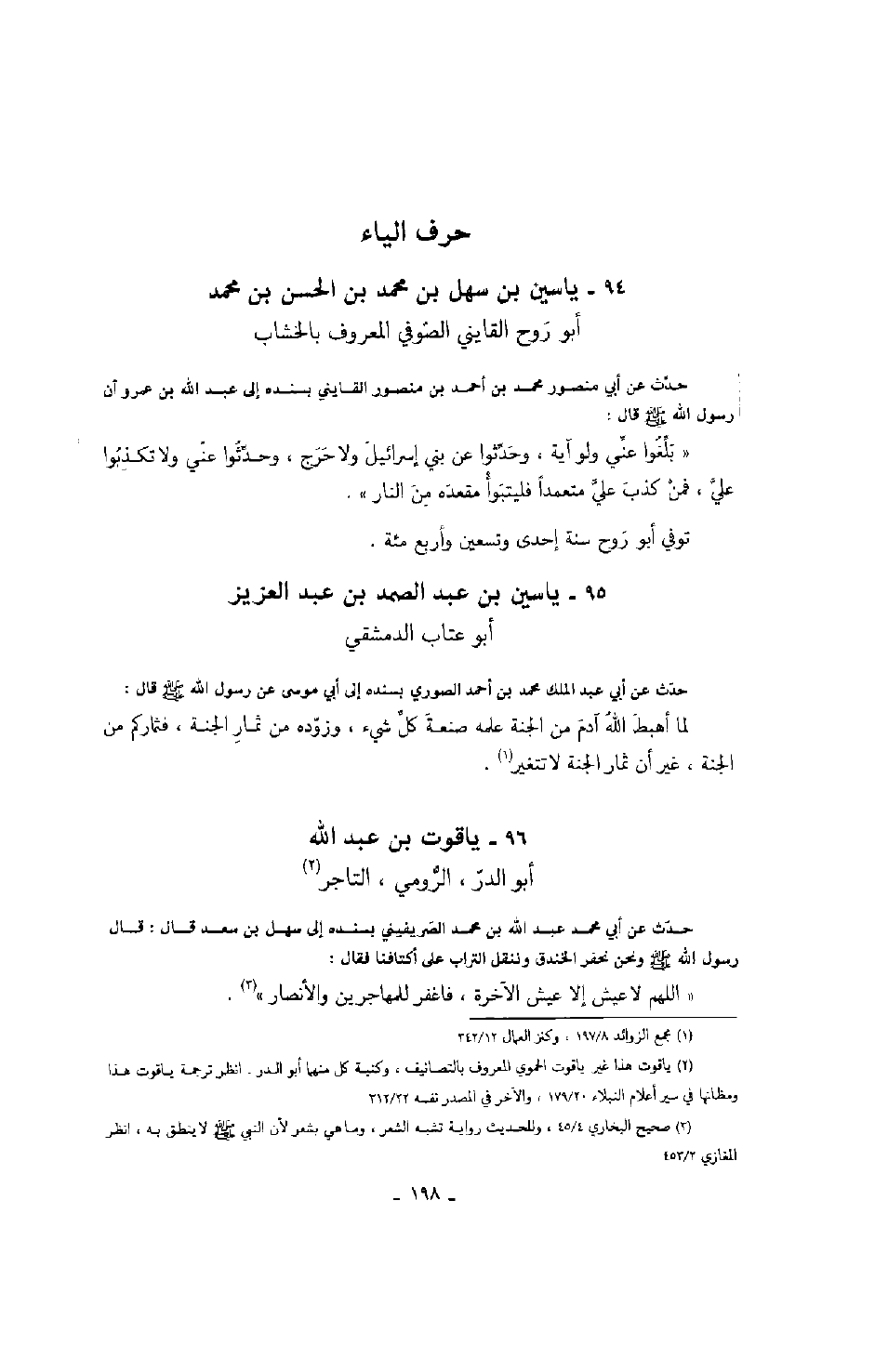 ابن محمد، أبو روح القايني الصوفي المعروف بالخشاب حدث عن أبي منصور محمد بن أحمد بن منصور القايني بسنده إلى عبد الله بن عمرو أن رسول الله صَلَّى اللهُ عَلَيْهِ وَسَلَّمَ قال: " بلغوا عني ولو آية، وحدثوا عن بني إسرائيل ولا حرج، وحدثوا عني ولا تكذبوا علي، فمن كذب علي متعمداً فليتبوأ مقعده من النار ".