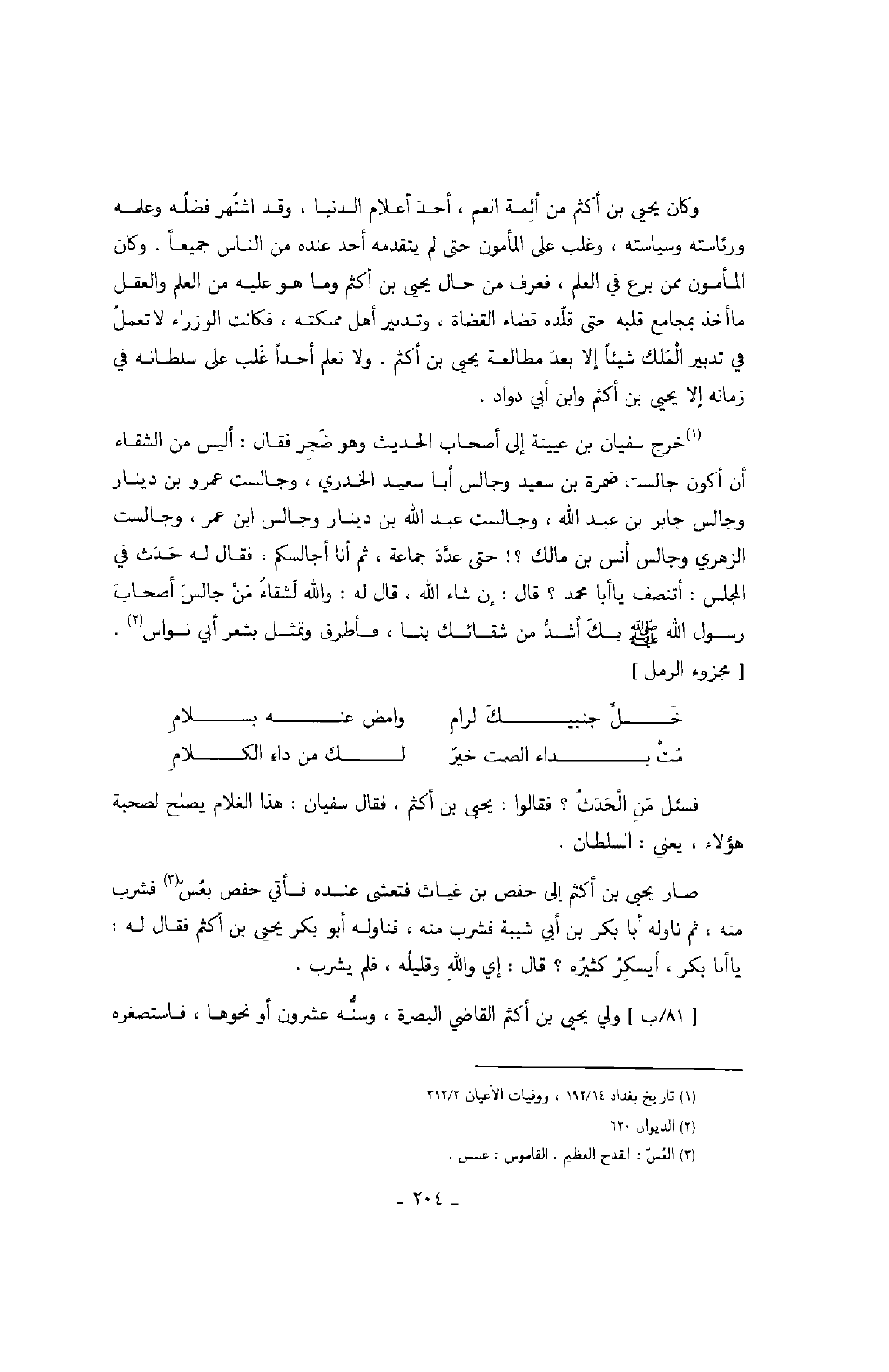 فسئل من الحدث؟ فقالوا: يحيى بن أكثم، فقال سفيان: هذا الغلام يصلح لصحبة هؤلاء، يعني: السلطان.