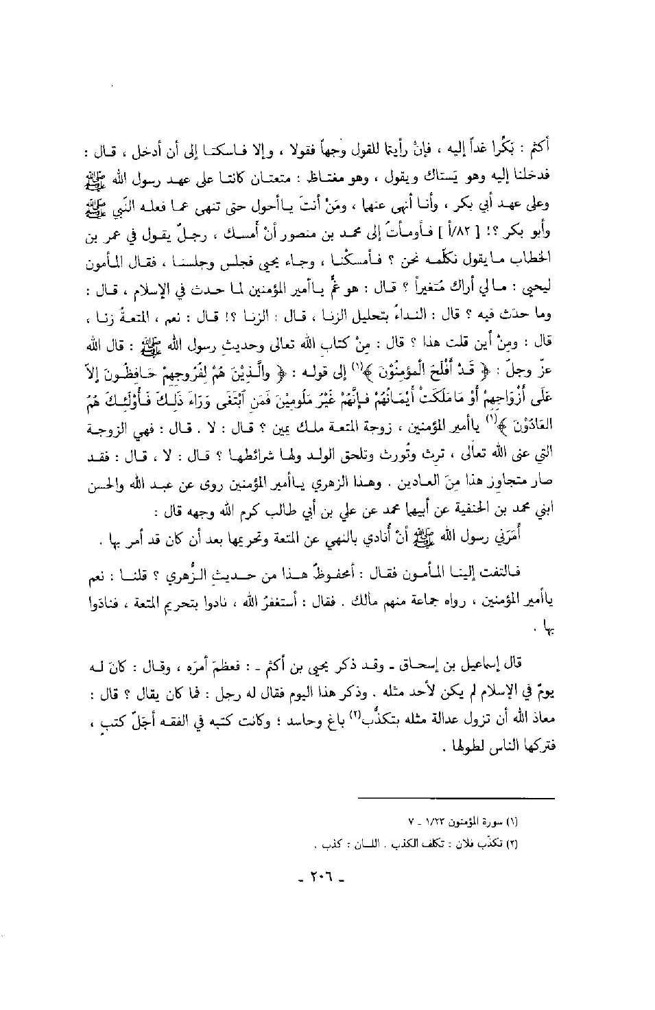 أكثم: بكرا غداً إليه، فإن رأيتما للقول وجهاً فقولا، وإلا فاسكتا إلى أن أدخل، قال: فدخلنا غليه وهو يستاك ويقول، وهو مغتاظ: متعتان كانتا على عهد رسول الله صَلَّى اللهُ عَلَيْهِ وَسَلَّمَ وعلى عهد أبي بكر، وأنا أنهى عنهما، ومن أنت يا أحول حتى تنهى عما فعله النبي صَلَّى اللهُ عَلَيْهِ وَسَلَّمَ وأبو بكر؟؟؟؟؟؟؟؟ فأومأت إلى محمد بن منصور ان أمسك، رجل يقول في عمر بن الخطاب ما يقول نكلمه نحن؟ فأمسكنا، وجاء يحيى فجلس وجلسنا، فقال المأمون ليحيى: ما لي أراك متغيراً؟ قال: هو غم يا أمير المؤمنين لما حدث في الإسلام، قال: وما حدث فيه؟ قال: النداء بتحليل الزنا، قال: الزنا؟؟ قال: نعم، المتعة زنا، قال: ومن أين قلت هذا؟ قال: من كتاب الله تعالى وحديث رسول الله صَلَّى اللهُ عَلَيْهِ وَسَلَّمَ: قال الله عز وجل: " قد أفلح المؤمنون " إلى قوله: " والذين هم لفروجهم حافظون إلا على أزواجهم أو ما ملكت أيمانهم فإنهم غير ملومين فمن ابتغى وراء ذلك فأولئك هم العادون " يا أمير المؤمنين، زوجة المتعة ملك يمين؟ قال: لا. قال: فهي الزوجة التي عنى الله تعالى، ترث وتورث وتلحق الولد ولها شرائطها؟ قال: لا، قال: فقد صار متجاوز هذا من العادين. وهذا الزهري يا أمير المؤمنين روى عن عبد الله والحسن ابني محمد بن الحنفية عن أبيهما محمد عن علي بن أبي طالب كرم الله وجهه قال: " أمرني رسول الله صَلَّى اللهُ عَلَيْهِ وَسَلَّمَ أن أنادي بالنهي عن المتعة وتحريمها بعد أن كان قد أمر بها.
