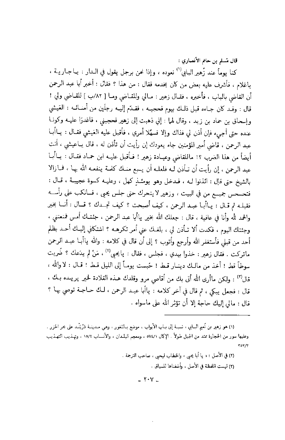 قال مسلم بن حاتم الأنصاري: كنا يوماً عند زهير البابي نعوده، وإذا نحن برجل يقول في الدار: يا جارية، يا غلام، فأشرف عليه بعض من كان يخدمه فقال: من هذا؟ فقال: أخبر أبا عبد الرحمن أن القاضي بالباب، فأخبره، فقال زهير: مالي وللقاضي وما للقاضي ولي قال: وقد كان جاءه قبل ذلك بيوم فحجبه، فقدم إليه رجلين من أمنائه: العيشي وإسحاق بن حماد بن زيد، وقال لهما: إني ذهبت إلى زهير فحجبني، فاغدوا عليه وكونا عنده حتى أجيء فإن أذن لي فذاك وإلا فسهلا أمري، فأقبل عليه العيشي فقال: يا أبا عبد الرحمن، قاضي أمير المؤمنين جاء يعودك إن رأيت أن تأذن له، قال يا عيشي، أنت أيضاً من هذا الضرب؟ ما للقاضي وعبادة زهير فأقبل عليه ابن حماد فقال: يا أبا عبد الرحمن، إن رأيت أن تأذن له فلعله أن يسمع منك كلمة ينفعه الله بها، فما زالا بالشيخ حتى قال: ائذنوا له، فدخل وهو يومئذ كهل، وعليه كسوة عجيبة، قال: فتحسحس جميع من في البيت، وزهير لا يتحرك حتى جلس يحيى، فانكب على رأسه فقبله ثم قال: يا أبا عبد الرحمن، كيف أصبحت؟ كيف تجدك؟ قال: أنا بخير والحمد لله وأنا في عافية، قال: جعلك الله بخير يا أبا عبد الرحمن، جئتك أمس فمنعتني، وجئتك اليوم، فكدت ألا تأذن لي، بلغك عني أمر تكرهه؟ اشتكاني إليك أحد بظلم أحد من قبلي فأستغفر الله وأرجع وأتوب؟ إلى أن قال في كلامه: والله يا أبا عبد الرحمن ما تركت. فقال زهير: خذوا بيدي، فجلس، فقال: يا يحيى، من لم يدعك؟ ضربت سوطاً قط أخذ من مالك دينار قط حبست يوماً إلى الليل قط قال: لا والله، قال: ولكن ما أرى الله أتى بك من أقاصي مرو وقلدك هذه القلادة لخير يريده بك، قال: فجعل يبكي، ثم قال في آخر كلامه: يا أبا عبد الرحمن، لك حاجة توصي بها؟ قال: مالي إليك حاجة إلا أن تؤثر الله على ما سواه.