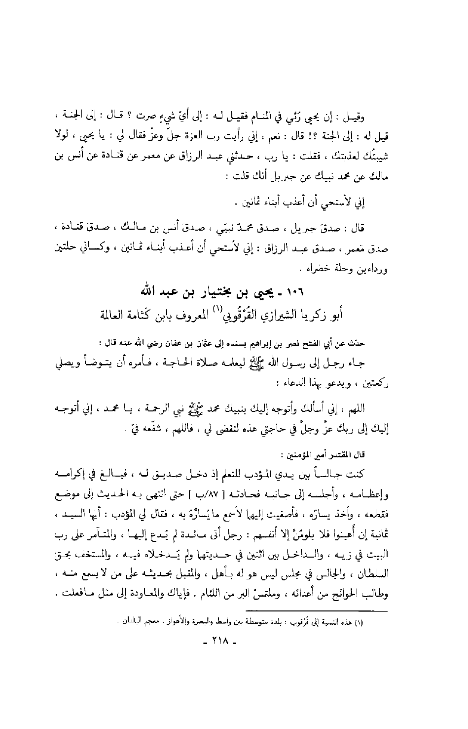 أبو زكريا الشيرازي القرقوبي، المعروف بابن كثامة العالمة حدث عن أبي الفتح نصر بن إبراهيم بسنده إلى عثمان بن عفان رضي الله عنه قال: جاء رجل إلى رسول الله صَلَّى اللهُ عَلَيْهِ وَسَلَّمَ ليعلمه صلاة الحاجة، فأمر أن يتوضأ ويصلي ركعتين، ويدعو بهذا الدعاء: اللهم، إني أسألك وأتوجه إليك بنبيك محمد صَلَّى اللهُ عَلَيْهِ وَسَلَّمَ نبي الرحمة، يا محمد، إني أتوجه إليك بربك عز وجل في حاجتي هذه لتقضى لي، فاللهم، شفعه في.
