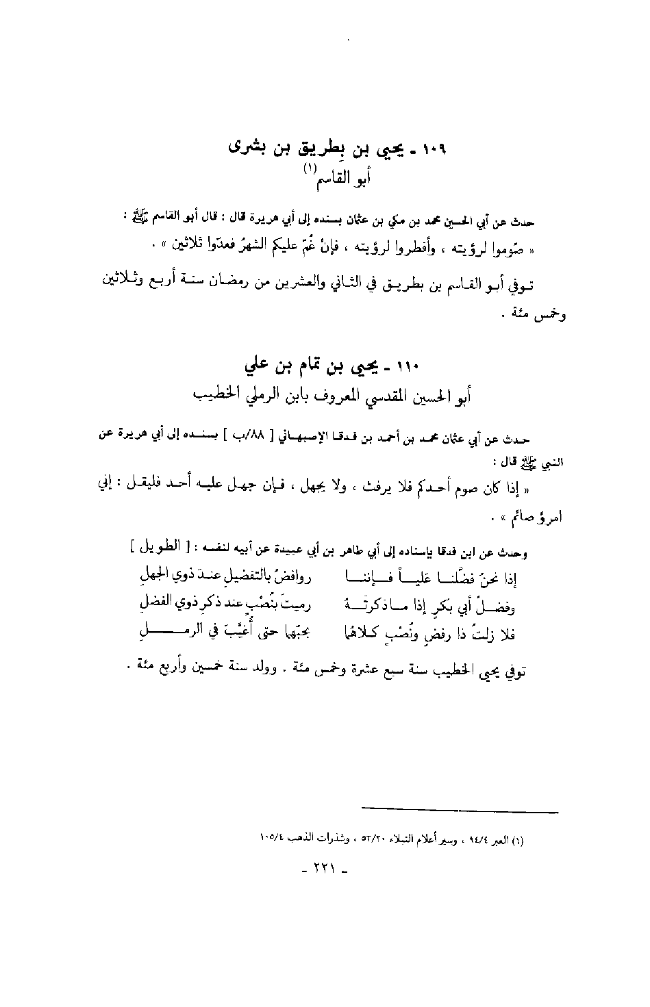 أبو الحسين المقدسي المعروف بابن الرملي الخطيب حدث عن أبي عثمان محمد بن أحمد بن فدقا الإصبهاني بسنده إلى أبي هريرة عن النبي صَلَّى اللهُ عَلَيْهِ وَسَلَّمَ قال: " إذا كان صوم أحدكم فلا يرفث، ولا يجهل، فإن جهل عليه أحد فليقل: إني امرؤ صائم ".