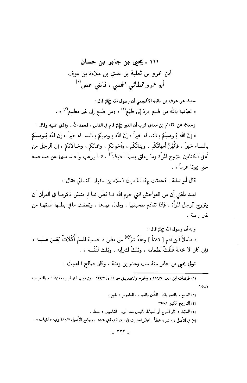 ابن عمرو بن ثعلبة بن عدي بن ملاءة بن عوف، أبو عمرو الطائي الحمصي، قاضي حمص حدث عن عوف بن مالك الأشجعي أن رسول الله صَلَّى اللهُ عَلَيْهِ وَسَلَّمَ قال: " تعوذوا بالله من طمع يرد إلى طبع، ومن طمع إلى غير مطمع ".