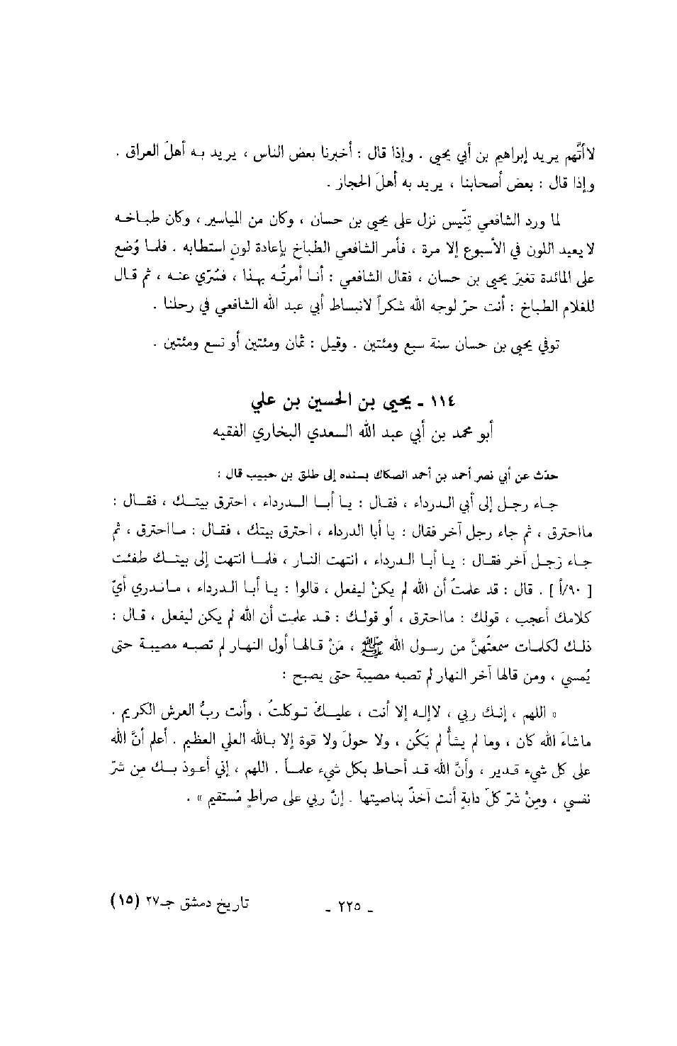 جاء رجل إلى أبي الدرداء، فقال: يا أبا الدرداء، احترق بيتك، فقال: ما احترق، ثم جاء رجل آخر فقال: يا أبا الدرداء، احترق بيتك، فقال: ما احترق، ثم جاء رجل آخر فقال: يا أبا الدرداء، انتهت النار، فلما انتهت إلى بيتك طفئت. قال: قد علمت أن الله لم يكن ليفعل، قالوا: يا أبا الدرداء، ما ندري أي كلامك أعجب، قولك: ما احترق، أو قولك: قد علمت أن الله لم يكن ليفعل، قال: ذلك لكلمات سمعتهن من رسول الله صَلَّى اللهُ عَلَيْهِ وَسَلَّمَ، من قالها أول النهار لم تصبه مصيبة حتى يمسي، ومن قالها آخر النهار لم تصبه مصيبة حتى يصبح: " اللهم، إنك ربي، لا إله إلا أنت، عليك توكلت، وأنت رب العرش الكريم. ما شاء الله كان، وما لم يشأ لم يكن، ولا حول ولا قوة إلا بالله العلي العظيم. أعلم أن الله على كل شيء قدير، وأن الله قد أحاط بكل شيْ علماً. اللهم، إني أعوذ بك من شر نفسي، ومن شر كل دابة أنت آخذ بناصيتها. إن ربي على صراط مستقيم ".