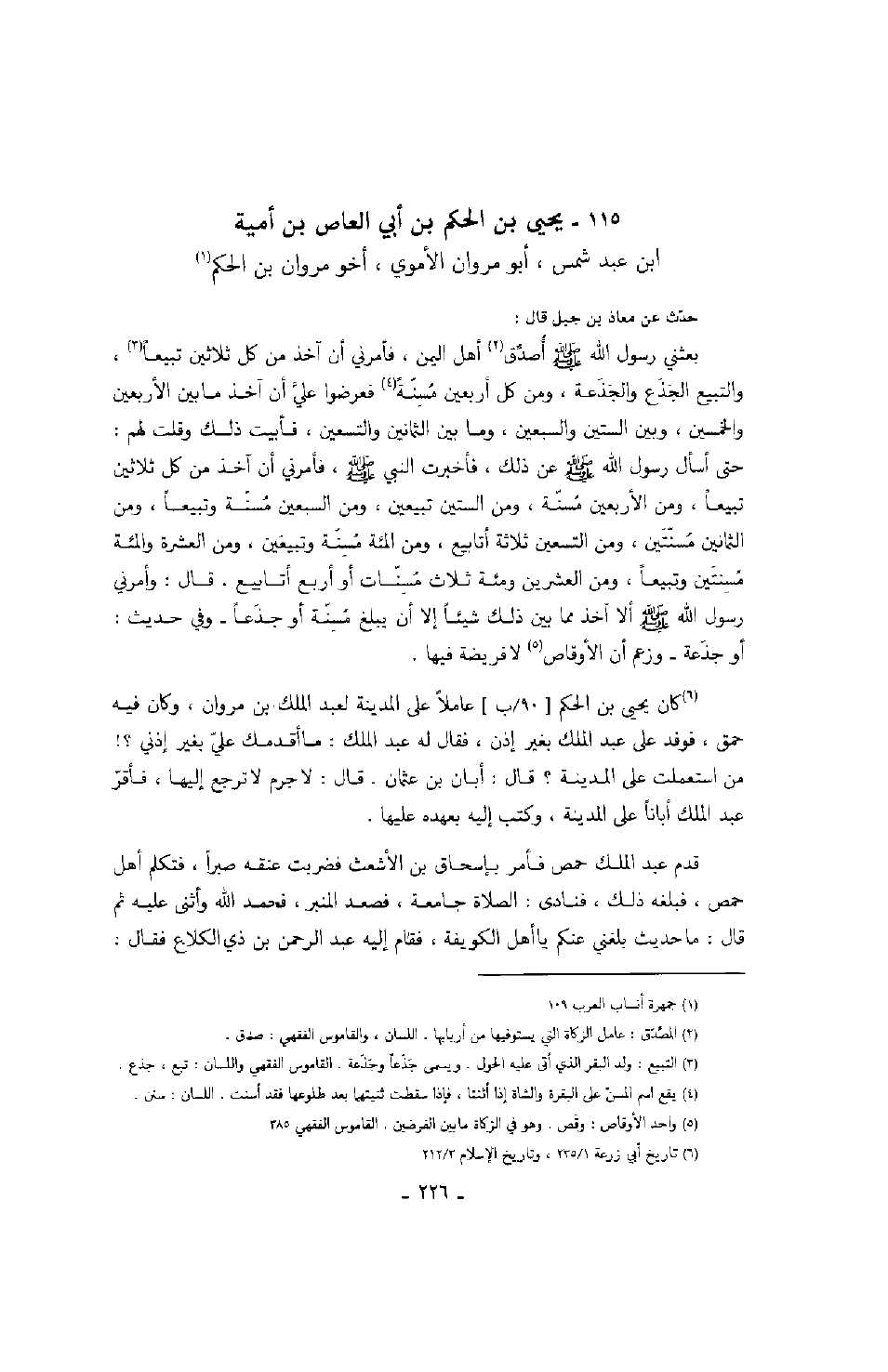 ابن عبد شمس، أبو مروان الأموي، أخو مروان بن الحكم حدث عن معاذ بن جبل قال: بعثني رسول الله صَلَّى اللهُ عَلَيْهِ وَسَلَّمَ اصدق أهل اليمن، فأمرني أن آخذ من كل ثلاثين تبيعا "، والتبيع الجذع والجذعة، ومن كل أربعين مسنة فعرضوا علي أن آخذ ما بين الأربعين والخمسين، وبين الستين والسبعين، وما بين الثمانين والتسعين، فأبيت ذلك وقلت لهم: حتى أسأل رسول الله صَلَّى اللهُ عَلَيْهِ وَسَلَّمَ عن ذلك، فأخبرت النبي صَلَّى اللهُ عَلَيْهِ وَسَلَّمَ، فأمرني أن آخذ من كل ثلاثين تبيعاً، ومن الأربعين مسنة، ومن الستين تبيعين، ومن السبعين مسنة وتبيعاً، ومن الثمانين مسنتين، ومن التسعين ثلاثة أتابيع، ومن المئة مسنة وتبيعين، ومن العشرة والمئة مسنتين وتبيعاً، ومن العشرين ومئة ثلاث مسنات أو أربع أتابيع. قال: وأمرني رسول الله صَلَّى اللهُ عَلَيْهِ وَسَلَّمَ ألا آخذ مما بين ذلك شيئاً إلا أن يبلغ مسنة أو جذعاً - وفي حديث: أو جذعة - وزعم أن الأوقاص لا فريضة فيها.