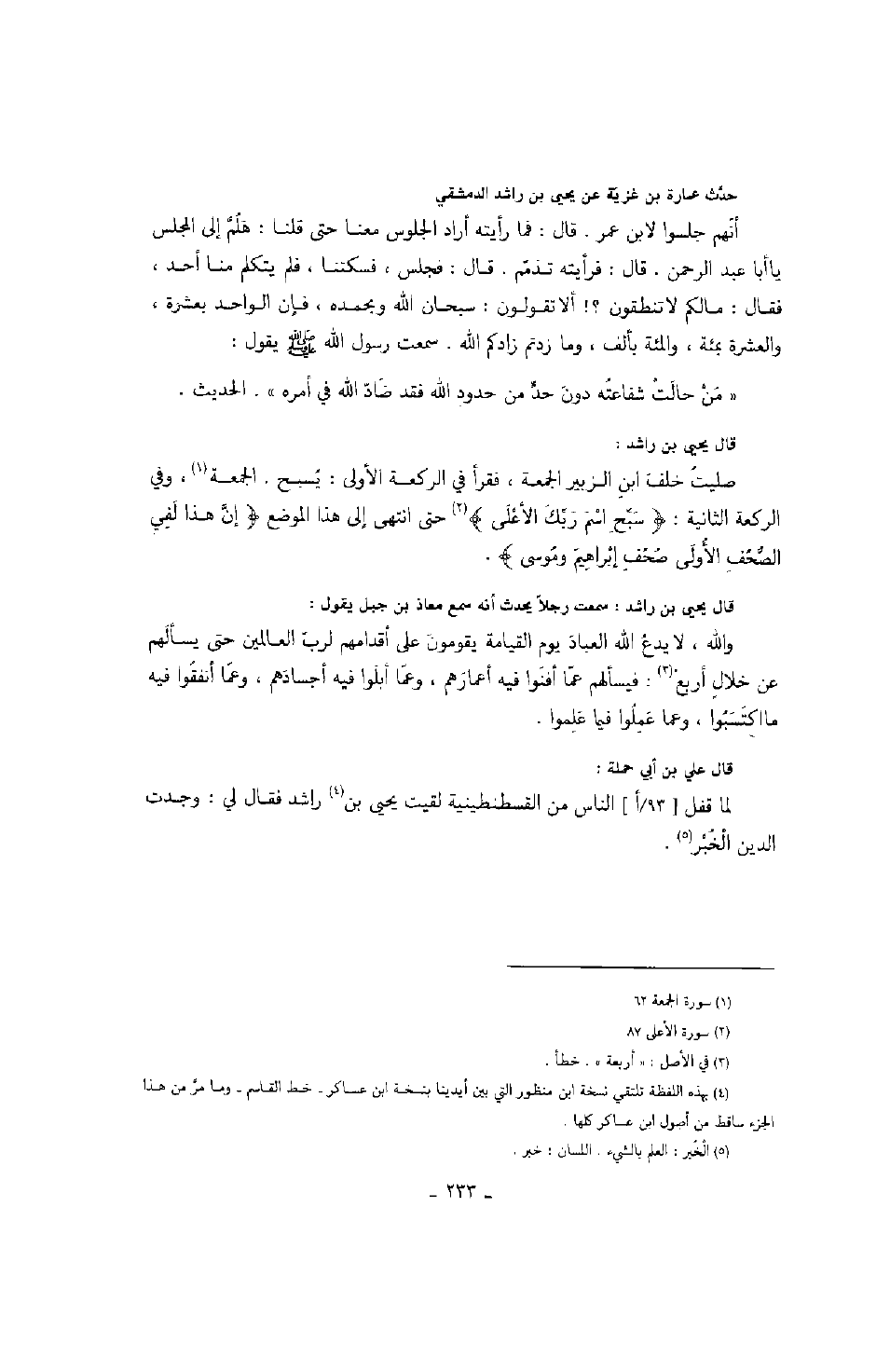 قال يحيى بن راشد: صليت خلف ابن الزبير الجمعة، فقرأ في الركعة الأولى: يسبح. الجمعة، وفي الركعة الثانية: " سبح اسم ربك الأعلى " حتى انتهى إلى هذا الموضع " إن هذا لفي الصحف الأولى صحف إبراهيم وموسى ".