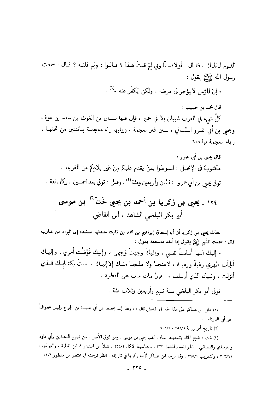 ابن يحيى خت بن موسى أبو بكر البلخي الشاهد، ابن القاضي حدث يحيى بن زكريا أن أبا إسحاق إبراهيم بن محمد بن ثابت حدثهم بسنده إلى البراء بن عازب قال: سمعت النبي صَلَّى اللهُ عَلَيْهِ وَسَلَّمَ يقول إذا أخذ مضجعه يقول: " إليك اللهم أسلمت نفسي، وإليك وجهت وجهي، وإليك فوضت أمري، وإليك ألجأت ظهري رغبة ورهبة، لا منجا ولا ملتجا منك إلا إليك، آمنت بكتابك الذي أنزلت، ونبيك الذي ارسلت ". فإن مات مات على الفطرة.