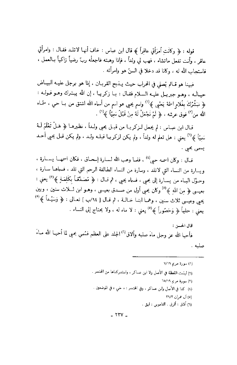 قال: وكان اسمه حي، فلما وهب الله لسارة إسحاق، فكان اسمها يسارة، ويسارة من النساء التي لا تلد، وسارة من النساء الطالقة الرحم التي تلد، فسماها سارة، وحول الياء من يسارة إلى يحيى، فسماه يحيى، ثم قال: " مصدقاً بكلمة " يعني: بعيسى " من الله " وكان يحيى أول من صدق بعيسى، وهو ابن ثلاث سنين، وبين يحيى وعيسى ثلاث سنين، وهما ابنا خالة، ثم قال تعالى: " وسيدا " يعني: حليماً " وحصوراً " يعني: لا ماء له، ولا يحتاج إلى النساء.