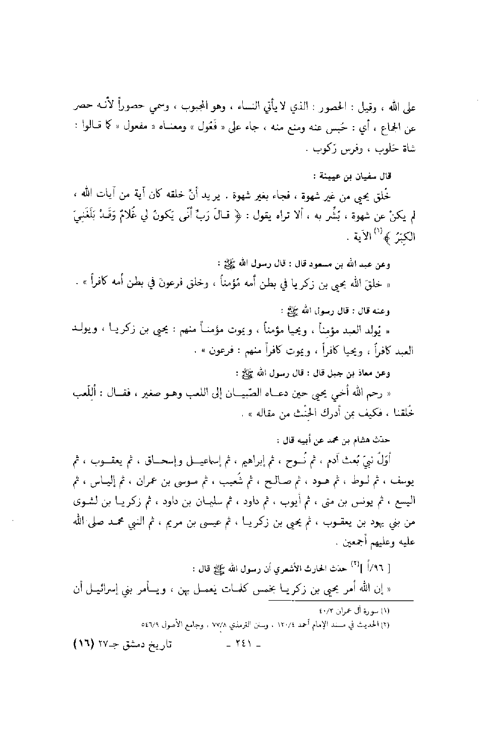 وعن عبد الله بن مسعود قال: قال رسول الله صَلَّى اللهُ عَلَيْهِ وَسَلَّمَ: " خلق الله يحيى بن زكريا في بطن أمه مؤمناً، وخلق فرعون في بطن أمه كافراً ". وعنه قال: قال رسول الله صَلَّى اللهُ عَلَيْهِ وَسَلَّمَ: " يولد العبد مؤمناً، ويحيا مؤمناً، ويموت مؤمناً منهم: يحيى بن زكريا، ويولد العبد كافراً، ويحيا كافراً، ويموت كافراً منهم: فرعون ".