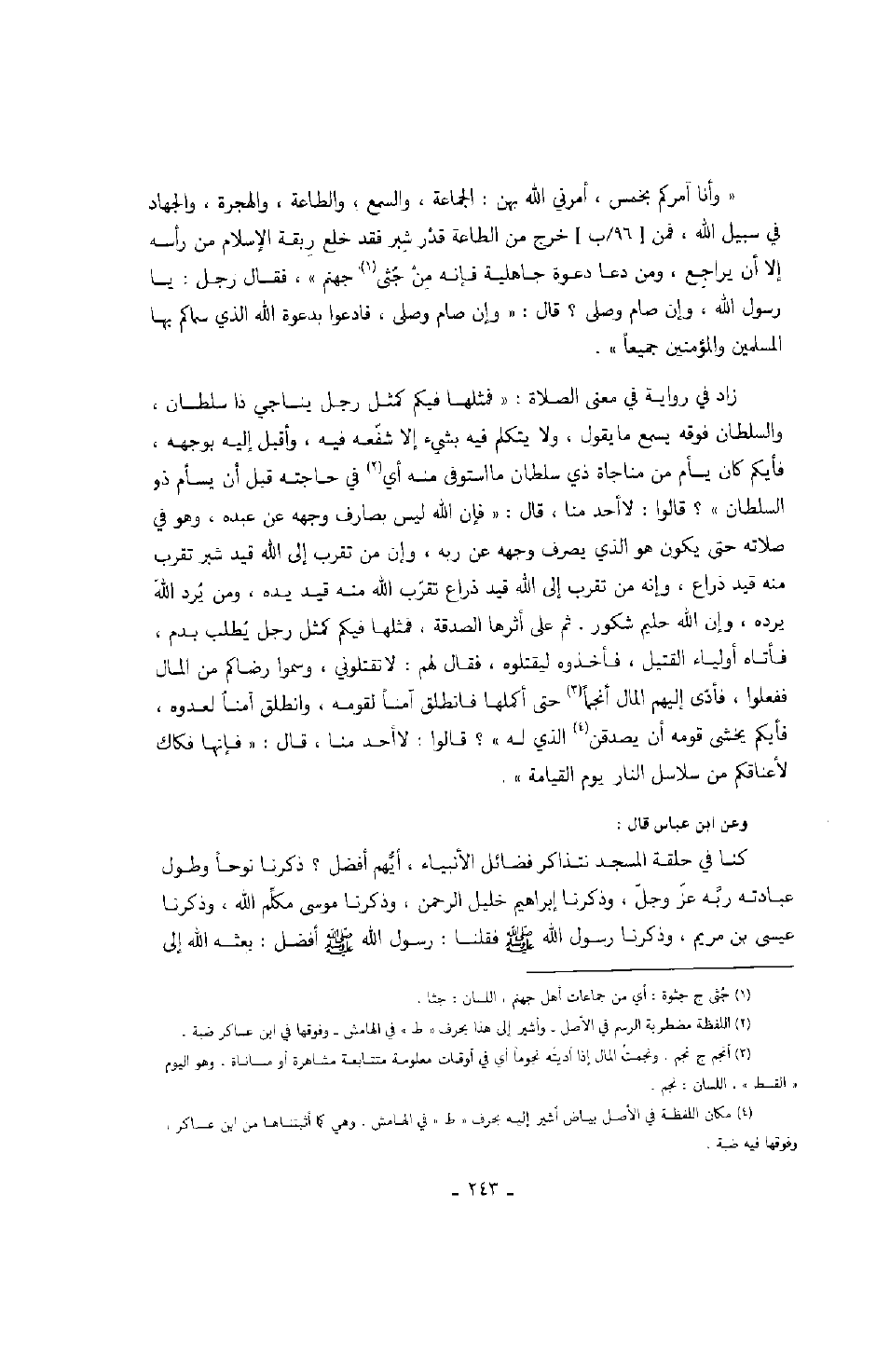 وأنا آمركم بخمس، أمرني الله بهن: الجماعة، والسمع، والطاعة، والهجرة، والجهاد في سبيل الله فمن خرج من الطاعة قدر سبر فقد خلع ربقة الإسلام من رأسه إلا أن يراجع، ومن دعا دعوة جاهلية فإنه من جثى جهنم "، فقال رجل: يا رسول الله، وإن صام وصلى؟ قال: " وإن صام وصلى، فادعوا بدعوة الله الذي سماكم بها المسلمين والمؤمنين جميعاً ".