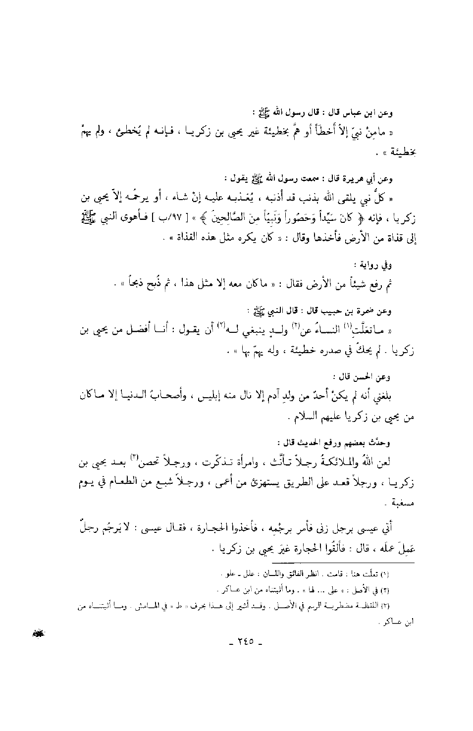 وعن أبي هريرة قال: سمعت رسول الله صَلَّى اللهُ عَلَيْهِ وَسَلَّمَ يقول: " كل نبي يلقى الله بذنب قد أذنبه، يعذبه عليه إن شاء، أو يرحمه إلا يحيى بن زكريا، فإنه " كان سيداً وحصوراً ونبياً من الصالحين " فأهوى النبي صَلَّى اللهُ عَلَيْهِ وَسَلَّمَ إلى قذاة من الأرض فأخذها وقال: " كان يكره مثل هذهالقذاة ".