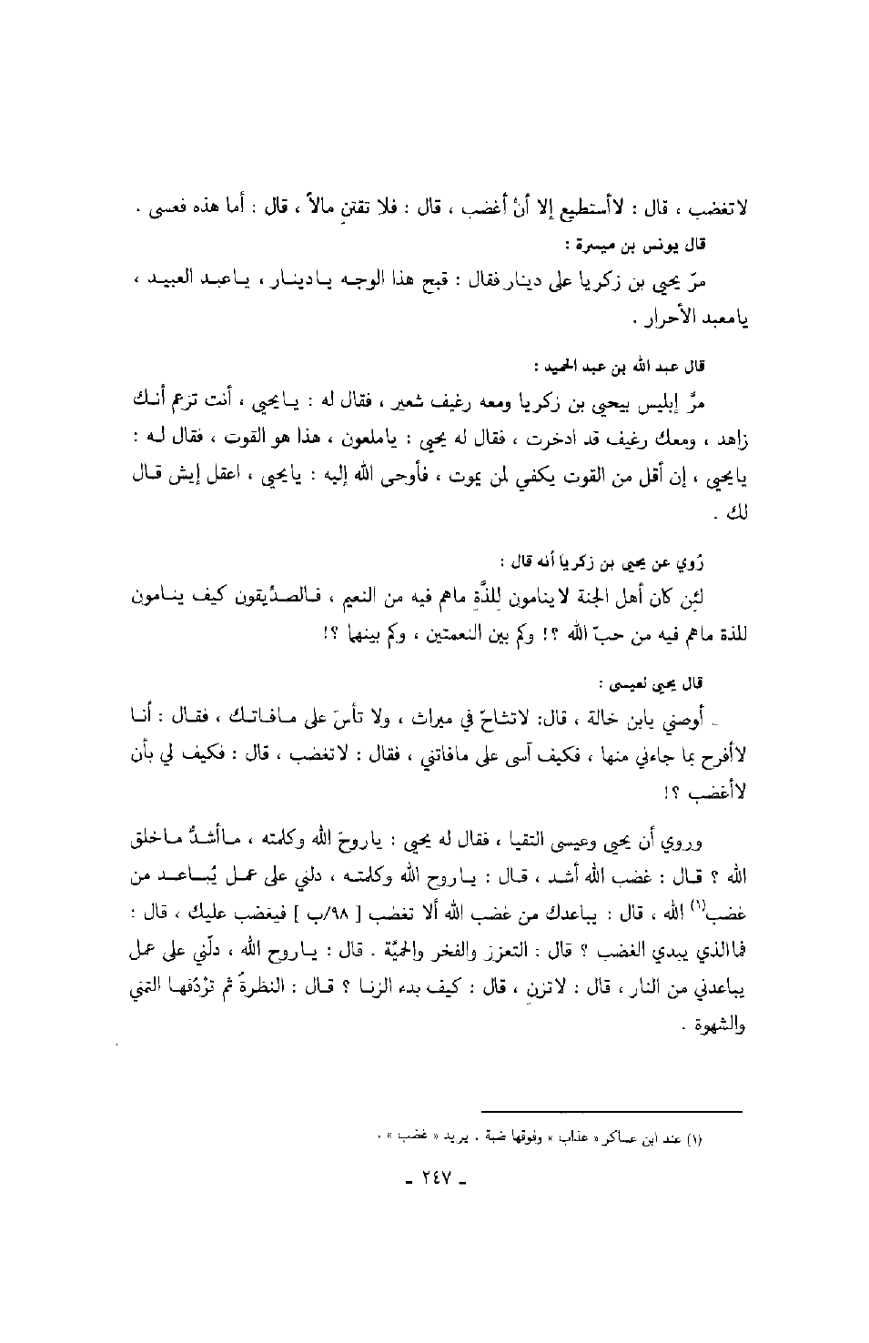 روي عن يحيى بن زكريا أنه قال: لئن كان أهل الجنة لا ينامون للذة ما هم فيه من النعيم، فالصديقون كيف ينامون للذة ما هم فيه من حب الله؟! وكم بين النعمتين، وكم بينهما؟! قال يحيى لعيسى: أوصني يا بن خالة، قال: لا تشاح في ميراث، ولا تأس على ما فاتك، فقال: أنا لا أفرح بما جاءني منها، فكيف آسى على ما فاتني، فقال: لا تغضب، قال: فكيف لي بأن لا أغضب؟! وروى أن يحيى وعيسى التقيا، فقال له يحيى: يا روح الله وكلمته، ما أشد ما خلق الله؟ قال: غضب الله أشد، قال: يا روح الله وكلمته، دلني على عمل يباعد من غضب الله، قال: يباعدك من غضب الله ألا تغضب فيغضب عليك، قال: فما الذي يبدي الغضب؟ قال: التعزز والفخر والحمية. قال: يا روح الله، دلني على عمل يباعدني من النار، قال: لا تزن، قال: كيف بدء الزنا؟ قال: النظرة ثم تردفها التمني والشهوة.