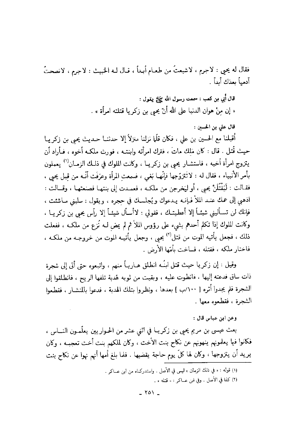 قال علي بن الحسين: أقبلنا مع الحسين بن علي، فكان قلما نزلنا منزلاً إلا حدثنا حديث يحيى بن زكريا حيث قتل. قال: كان ملك مات، فترك امرأته وابنته، فورث ملكه أخوه، فأراد أن يتزوج امرأة أخيه، فاستشار يحيى بن زكريا، وكانت الملوك في ذلك الزمان يعملون بأمر الأنبياء، فقال له: لا تتزوجها فإنها بغى، فسمعت المرأة وعرفت أنه من قبل يحيى، فقالت: ليقتلن يحيى، أو ليخرجن من ملكه، فعمدت إلى بنتها فصنعتها، وقالت: اذهبي إلى عمك عندالملأ فإنه يدعوك ويجلسك في حجره، ويقول: سليني ما شئت، فإنك لن تسأليني شيئاً إلا أعطيتك، فقولي: لا أسأل شيئاً إلا رأس يحيى بن زكريا، وكانت الملوك إذا تكلم أحدهم بشيء على رؤوس الملأ ثم لم يمض له نزع من ملكه، ففعلت ذلك، فجعل يأتيه الموت من قتل يحيى، وجعل يأتيه الموت من خروجه من ملكه، فاختار ملكه، فقتله، فساخت بأمها الأرض.