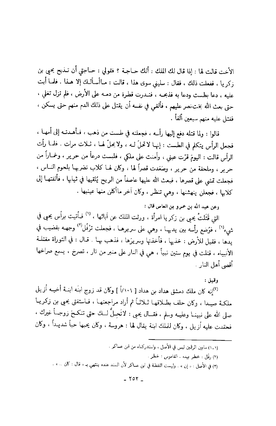 وعن عبد الله بن عمرو بن العاص قال: التي قتلت يحيى بن زكريا امرأة، ورثت الملك عن آبائها، فأتيت برأس يحيى في شيء، فوضع رأسه بين يديها، وهي على سريرها، فجعلت ترفل وجهه بقضيب في يدها، فقيل للأرض: خذيها، فأخذتها وسريرها، فذهب بها. قال: في التوراة مقتلة الأنبياء، قتلت في يوم ستين نبياً، هي في النار على منبر من نار، تصرخ، يسمع صراخها أقصى أهل النار. وقيل: إنه كان ملك دمشق هداد بن هداد وكان قد زوج ابنه ابنة أخيه أزيل ملكة صيدا، وكان حلف بطلاقها ثلاثاً ثم أراد مراجعتها، فاستفتى يحيى بن زكريا صلى الله على نبينا وعليه السلم، فقال يحيى: لا تحل لك حتى تنكح زوجاً غيرك، فحقدت عليه أزيل، وكان للملك ابنة يقال لها: هروسة، وكان يحبها حباً شديداً، وكان