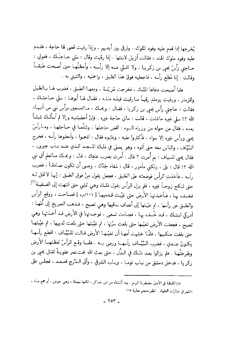يخرجها إذا قدم عليه وفود الملك، وترقى بين أيديهم، وإذا رقيت قضى لها حاجة، فقدم عليه وفود ملك الهند، فقالت أزيل لابنتها: إذا رقيت وقال: سلي حاجتك، فقولي: حاجتي رأس يحيى بن زكريا، ولا تقبلي منه إلا رأسه، وأعطتها حين أصبحت طبقاً وقالت: إذا قطع رأسه، فاجعليه فوق هذا الطبق، واحمليه، وائتيني به. فلما أصبحت دعاها الملك، فخرجت مزينة، ومعها الطبق، فضرب لها بالطبل والمزمار، ورقيت يومئذ رقياً ما رقيت قبله مثله، فقال لها أبوها: سلي حاجتك، فقالت: حاجتي رأس يحيى بن زكريا، فقال: ويحك، ما تصنعين برأس نبي من أنبياء الله؟! سلي غيره ما شئت، قالت: ما لي حاجة غيره. فإن أعطيتنيه وإلا لم أسألك شيئاً بعده، فقال من حوله من وزراء السوء: اقض حاجتها، وشفعنا في حاجتها، وما رأس يحيى ورأس غيره إلا سواء، فأكثروا عليه، وغلبوه فقال: اذهبوا، وأعطوها رأسه، فخرج السياف، والناس معه حتى أتوه، وهو يصلي في ذلك المسجد الذي عند باب جيرون، فقال يحيى للسياف: بم أمرت؟ قال: أمرت بضرب عنقك، قال: ويحك ما تعلم أني نبي الله؟! قال: بلى، ولكني مأمور، قال: شقاء جدك، وعسى أن تكون صادقاً، فضرب رأسه، فأخذت الرأس فوضعته على الطبق، فجعل يقول من فوق الطبق: إنها لا تحل له حتى تنكح زوجاً غيره، فلم يزل الرأس يقول ذلك وهي تمشي حتى انتهت إلى الفسقية فخسف بها، فأخذتها الأرض حتى غيبت قدميها فصاحت، ووقع الرأس والطبق عن رأسها، ثم غيبتها إلى أنصاف ساقيها وهي تصيح، فذهب الصريخ إلى أمها: أدركي ابنتك، قد خسف بها، فجاءت تسعى، فوجدتها في الأرض قد أخذتها وهي تصيح، فجعلت الأرض تغيبها حتى بلغت سرتها، ثم غيبتها حتى بلغت ثدييها، ثم غيبتها حتى بلغت منكبيها، فلما خشيت أمها أن تغيبها الأرض قالت للسياف: اقطع رأسها يكون عندي، فضرب السياف رأسها ورمى به. فلما وقع الرأس لفظتها الأرض وطرحتها. فلم يزالوا بعد ذلك في الذل، حتى بعث الله بخت نصر عقوبة لقتل يحيى بن زكريا، فدخل دمشق من باب توما، وباب شرقي، وأتى الدرج فصعد، فجلس على