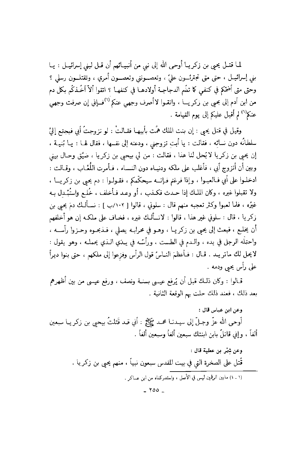 وقيل في قتل يحيى: إن بنت الملك همت بأبيها فقالت: لو تزوجت أبي فيجتمع إلي سلطانه دون نسائه، فقالت: يا أبت تزوجني، ودعته إلى نفسها، فقال لها: يا بنية، إن يحيى بن زكريا لا يحل لنا هذا، فقالت: من لي بيحيى بن زكريا، ضيق وحال بيني وبين أن أتزوج أبي، فأغلب على ملكه ودنياه دون النساء، فأمرت اللعاب، وقالت: ادخلوا على أبي فالعبوا، وإذا فرغتم فإنه سيحكمكم، فقولوا: دم يحيى بن زكريا، ولا تقبلوا غيره، وكان الملك إذا حدث فكذب، أو وعد فأخلف، خلع واستبدل به غيره، فلما لعبوا وكثر تعجبه منهم قال: سلوني، قالوا: نسألك دم يحيى بن زكريا، قال: سلوني غير هذا، قالوا: لا نسألك غيره، فخاف على ملكه إن هو أخلفهم أن يخلع، فبعث إلى يحيى بن زكريا، وهو في محرابه يصلي، فذبحوه وحزوا رأسه، واحتمله الرجل في يده، والدم في الطست، ورأسه في يدي الذي يحمله، وهو يقول: لا يحل لك ما تريد. قال: فأعظم الناس قول الرأس وفزعوا إلى ملكهم، حتى بنوا ديراً من على رأس يحيى ودمه. قالوا: وكان ذلك قبل أن يرفع عيسى بسنة ونصف، ورفع عيسى بين أظهرهم بعد ذلك، فعند ذلك حلت بهم الوقعة الثانية.