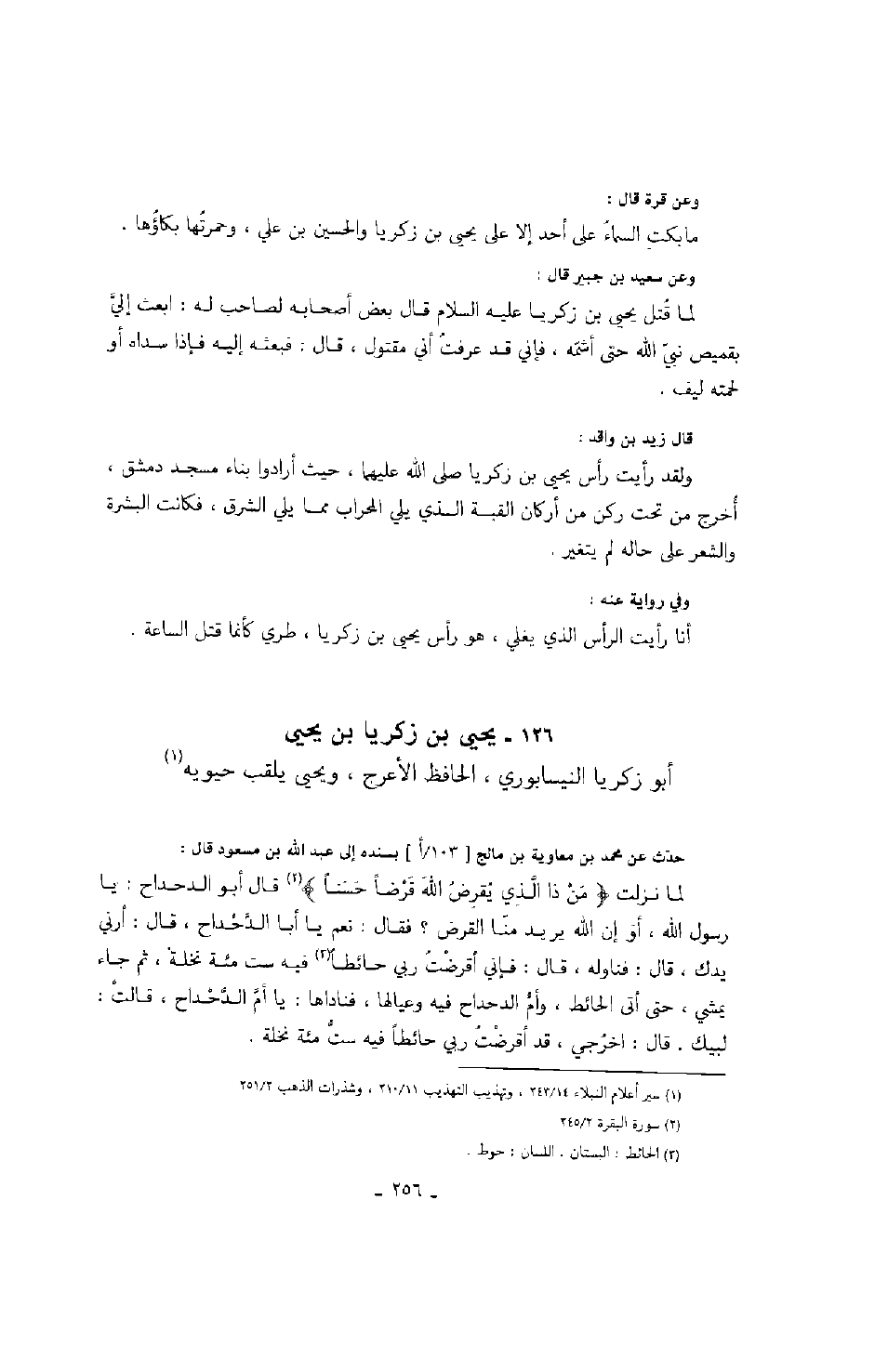 وعن قرة قال: ما بكت السماء على أحد إلا على يحيى بن زكريا والحسين بن علي، وحمرتها بكاؤها وعن سعيد بن جبير قال: لما قتل يحيى بن زكريا عليه السلام قال بعض أصحابه لصاحب له: ابعث إلي بقيص نبي الله حتى أسمه، فإني قد عرفت أني مقتول، قال: فبعثه إليه فإذا سداه أو لحمته ليف.