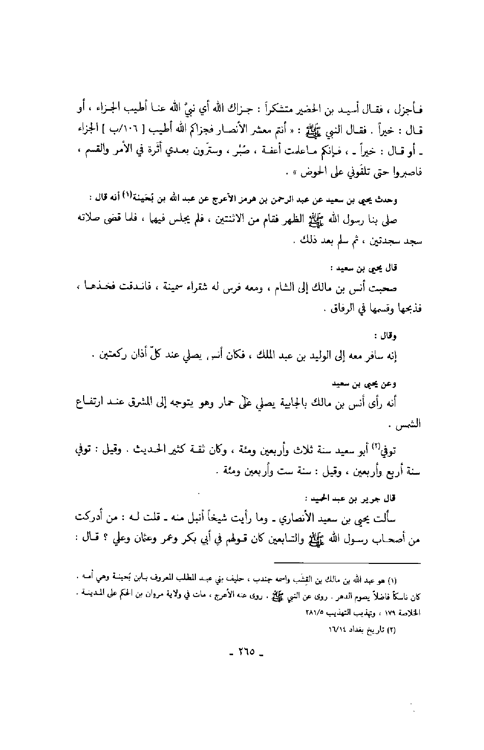 قال جرير بن عبد الحميد: سألت يحيى بن سعيد الأنصاري - وما رأيت شيخاً أنبل منه - قلت له: من أدركت من أصحاب رسول الله صَلَّى اللهُ عَلَيْهِ وَسَلَّمَ والتابعين كان قولهم في أبي بكر وعمر وعثمان وعلي؟ قال: