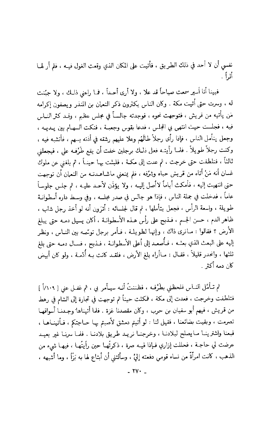 فبينا أنا أسير سمعت صياحاً قد علا، ولا أرى أحداً، فما راعني ذلك، ولا جبنت به، وسرت حتى أتيت مكة. وكان الناس يكثرون ذكر النعمان بن المنذر ويصفون إكرامه من يأتيه من قريش، فتوجهت نحوه، فوجدته جالساً في مجلس عظيم، وقد كثر الناس فيه، فجلست حيث انتهى بي المجلس، فدعا بقوس وجعبة، فنكت السهام بين يديه، وجعل يتأمل الناس، فإذا رأى رجلاً طالهم وعلا عليهم رشقه في أذنه بسهم، فأنشبه فيه، وكنت رجلاً طويلاً. فلما رأيته فعل ذلك برجلين خفت أن يقع طرفه علي، فيجعلني ثالثاً، فتلطفت حتى خرجت، ثم عدت إلى مكة، فلبثت بها حيناً، ثم بلغني عن ملوك غسان انه من أتاه من قريش حباه وشرفه، فلم يمنعني ما شاهدته من النعمان أن توجهت حتى انتهيت إليه، فأمكث أياماً لا أصل إليه، ولا يؤذن لأحد عليه، ثم جلس جلوساً عاماً، فدخلت في جملة الناس، فإذا هو جالس في صدر مجلسه، وفي وسط داره أسطوانة طويلة، واسعة الرأس، فجعل يتأملها، ثم قال لجلسائه: أترون أنه لو أخذ رجل شاب، ظاهر الدم، حسن الجسم، فذبح على رأس هذه الأسطوانة، أكان يسيل دمه حتى يبلغ الأرض؟ فقالوا: ما نرى ذاك، وإنها لطويلة، فأمر برجل توسمه بين الناس، ونظر إليه على البعث الذي بعثه، فأصعد إلى أعلى الأسطوانة، فذبح، فسال دمه حتى بلغ ثلثها، وانحدر قليلاً، فقال: ما أراه بلغ الأرض، فلقد كانت به أدمة، ولو كان أبيض كان دمه أكثر.