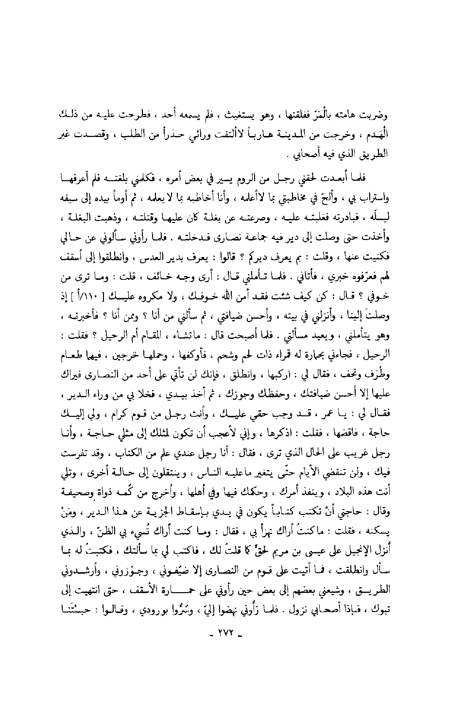 فلما أبعدت لحقني رجل من الروم يسير في بعض أمره، فكلمني بلغته فلم أعرفها واستراب بي، وألح في مخاطبتي بما لا أعلمه، وأنا أخاطبه بما لا يعلمه، ثم أومأ بيده إلى سيفه ليسله، فبادرته فغلبته عليه، وصرعته عن بغلة كان عليها وقتلته، وذهبت البغلة، وأخذت حتى وصلت إلى دير فيه جماعة نصارى فدخلته. فلما رأوني سألوني عن حالي فكنيت عنها، وقلت: بم يعرف ديركم؟ قالوا: يعرف بدير العدس، وانطلقوا إلى أسقف لهم فعرفوه خبري، فأتاني. فلما تأملني قال: أرى وجه خائف، قلت: وما ترى من خوفي؟ قال: كن كيف شئت فقد أمن الله خوفك، ولا مكروه عليك إذ وصلت إلينا، وأنزلني في بيته، وأحسن ضيافتي، ثم سألني من أنا؟ وممن أنا؟ فأخبرته، وهو يتأملني، ويعيد مسألتي. فلما أصبحت قال: ما تشاء، المقام أم الرحيل؟ فقلت: الرحيل، فجاءني بحمارة له قمراء ذات لحم وشحم، فأوكفها، وحملها خرجين، فيهما طعام وطرف وتحف، فقال لي: اركبها، وانطلق، فإنك لن تأتي على أحد من النصارى فيراك عليها إلا أحسن ضيافتك، وحفظك وجوزك، ثم أخذ بيدي، فخلا بي من وراء الدير، فقال لي: يا عمر، قد وجب حقي عليك، وأنت رجل من قوم كرام، ولي إليك حاجة، فاقضها، فقلت: اذكرها، وإني لأعجب أن تكون لمثلك إلى مثلي حاجة، وأنا رجل غريب على الحال الذي ترى، فقال: أنا رجل عندي علم من الكتاب، وقد تفرست فيك، ولن تنقضي الأيام حتى يتغير ما عليه الناس، وينتقلون إلى حالة أخرى، وتلي أنت هذه البلاد، وينفذ أمرك، وحكمك فيها وفي أهلها، وأخرج من كمه دواة وصحيفة وقال: حاجتي أن تكتب كتاباً يكون في يدي بإسقاط الجزية عن هذا الدير، ومن يسكنه، فقلت: ما كنت أراك تهزأ بي، فقال: وما كنت أراك تسيء بي الظن، والذي أنزل الإنجيل على عيسى بن مريم لحق كما قلت لك، فاكتب لي بما سألتك، فكتبت له بما سأل وانطلقت، فما أتيت على قوم من النصارى إلا ضيفوني، وجوزوني، وأرشدوني الطريق، وشيعني بعضهم إلى بعض حين رأوني على حمارة الأسقف، حتى انتهيت إلى تبوك، فإذا أصحابي نزول. فلما رأوني نهضوا إلي، وسروا بورودي، وقالوا: حبستنا