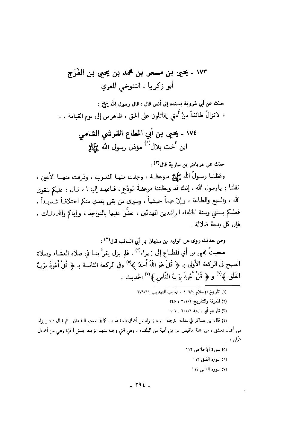 أبو زكريا، التنوخي المعري حدث عن أبي غروبة بسنده إلى أنس قال: قال رسول الله صَلَّى اللهُ عَلَيْهِ وَسَلَّمَ: " لا تزال طائفة من أمتي يقاتلون على الحق، ظاهرين إلى يوم القيامة ".