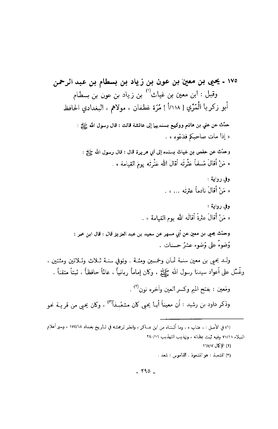 ابن بسطام بن عبد الرحمن وقيل: ابن معين بن غياث بن زياد بن عون بن بسطام أبو زكريا المري مرة غطفان، مولاهم، البغدادي الحافظ حدث عن علي بن هاشم ووكيع بسنديهما إلى عائشة قالت: قال رسول الله صَلَّى اللهُ عَلَيْهِ وَسَلَّمَ: " إذا مات صاحبكم فدعوه ".