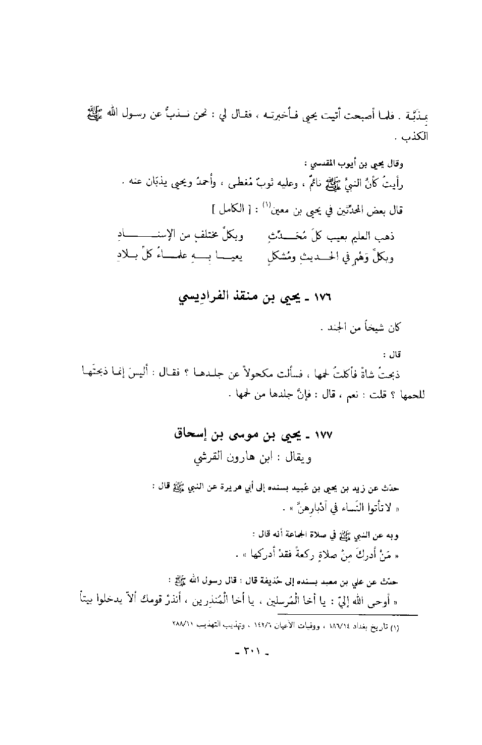 بمذبة. فلما أصبحت أتيت يحيى فأخبرته، فقال لي: نحن نذب عن رسول الله صَلَّى اللهُ عَلَيْهِ وَسَلَّمَ الكذب.