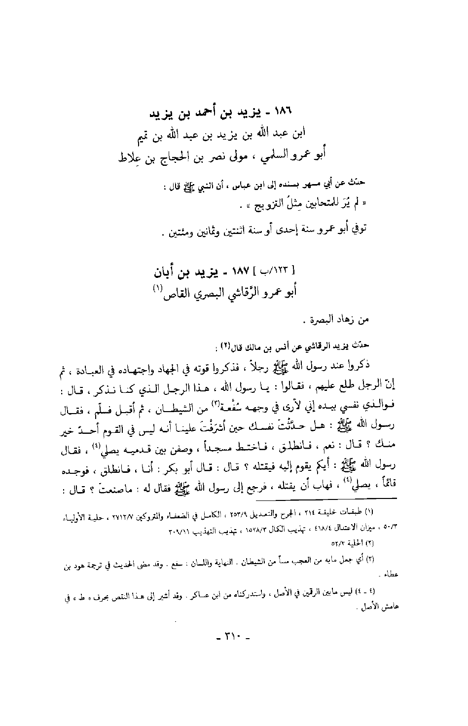 حدث يزيد الرقاشي عن أنس بن مالك قال: ذكروا عند رسول الله صَلَّى اللهُ عَلَيْهِ وَسَلَّمَ رجلاً، فذكروا قوته في الجهاد واجتهاده في العبادة، ثم إن الرجل طلع عليهم، فقالوا: يا رسول الله، هذا الرجل الذي كنا نذكر، قال: فوالذي نفسي بيده إني لأرى في وجهه سفعة من الشيطان، ثم أقبل فسلم، فقال رسول الله صَلَّى اللهُ عَلَيْهِ وَسَلَّمَ: هل حدثت نفسك حين أشرفت علينا أنه ليس في القوم أحد خير منك؟ قال: نعم، فانطلق، فاختط مسجداً، وصفن بين قدميه يصلي، فقال رسول الله صَلَّى اللهُ عَلَيْهِ وَسَلَّمَ: أيكم يقوم إليه فيقتله؟ قال: قال أبو بكر: أنا، فانطلق، فوجده قائماً، يصلي، فهاب أن يقتله، فرجع إلى رسول الله صَلَّى اللهُ عَلَيْهِ وَسَلَّمَ فقال له: ما صنعت؟ قال: