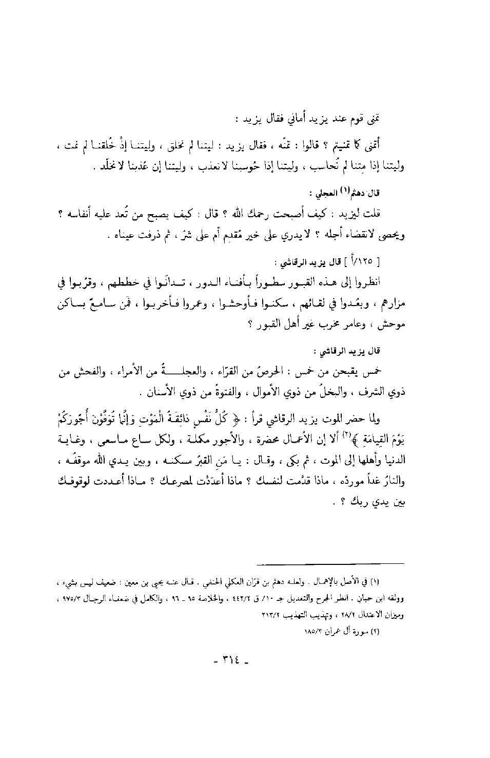 تمنى قوم عند يزيد أماني فقال يزيد: أتمنى كما تمنيتم؟ قالوا: تمنه، فقال يزيد: ليتنا لم نخلق، وليتنا إذ خلقنا لم نمت، وليتنا إذا متنا لم نحاسب، وليتنا إذا حوسبنا لا نعذب، وليتنا إن عذبنا لا نخلد.
