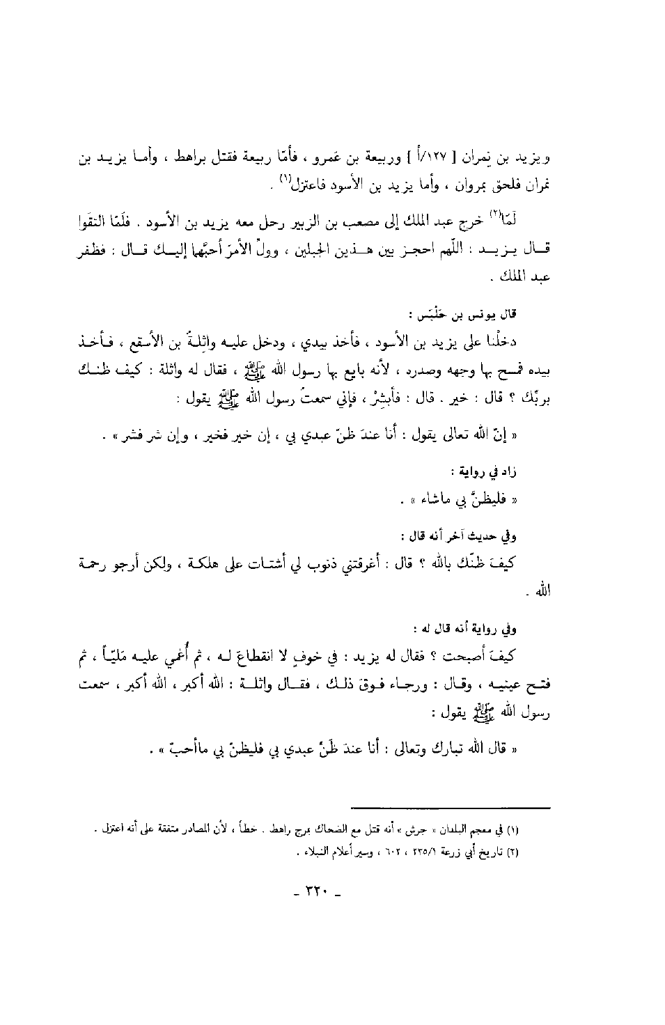 وفي رواية أنه قال له: كيف أصبحت؟ فقال له يزيد: في خوف لا انقطاع له، ثم أغمي عليه ملياً، ثم فتح عينيه، وقال: ورجاء فوق ذلك، فقال واثلة: الله أكبر، الله أكبر، سمعت رسول الله صَلَّى اللهُ عَلَيْهِ وَسَلَّمَ يقول: " قال الله تبارك وتعالى: أنا عند ظن عبدي بي فليظن بي ما أحب ".