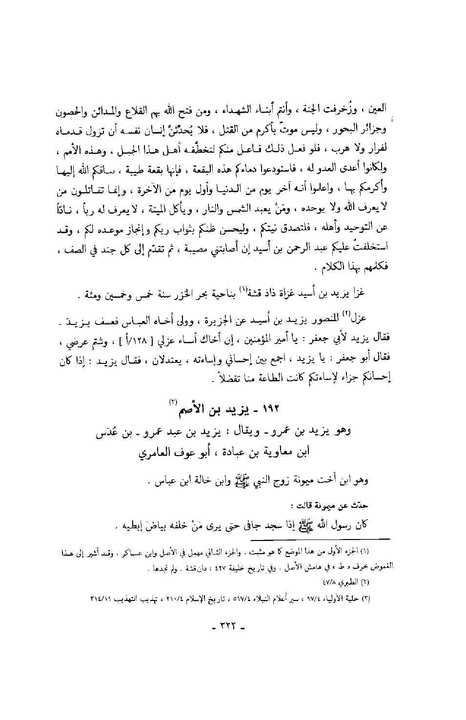 العين، وزخرفت الجنة، وأنتم أبناء الشهداء، ومن فتح الله بهم القلاع والمدائن والحصون وجزائر البحور، وليس موت بأكرم من القتل، فلا يحدثن إنسان نفسه أن تزول قدماه لفرار ولا هرب، فلو فعل ذلك فاعل منكم لتخطفه أهل هذا الجبل، وهذه الأمم، ولكانوا أعدى العدو له، فاستودعوا دماءكم هذه البقعة، فإنها بقعة طيبة، ساقكم الله إليها وأكرمكم بها، واعلموا أنه آخر يوم من الدنيا وأول يوم من الآخرة، وإنما تقاتلون من لا يعرف الله ولا يوحده، ومن يعبد الشمس والنار، ويأكل الميتة، لا يعرف له رباً، ناداً عن التوحيد وأهله، فلتصدق نيتكم، وليحسن ظنكم بثواب ربكم وإنجاز موعده لكم، وقد استخلفت عليكم عبد الرحمن بن أسيد إن أصابتني مصيبة، ثم تقدم إلى كل جند في الصف، فكلمهم بهذا الكلام.