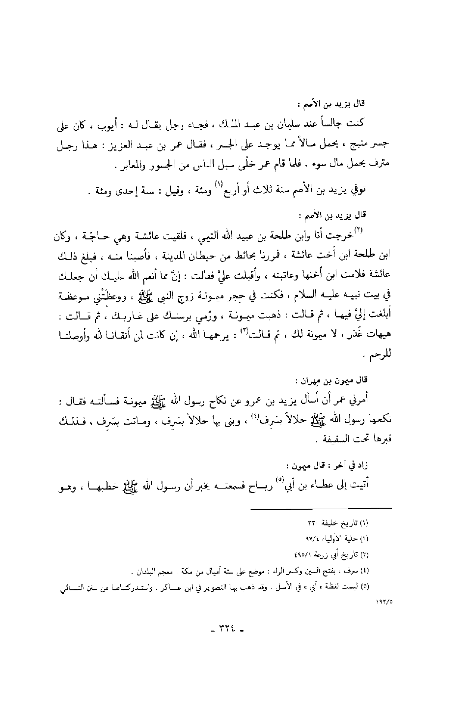 قال ميمون بن مهران: أمرني عمر أن أسأل يزيد بن عمرو عن نكاح رسول الله صَلَّى اللهُ عَلَيْهِ وَسَلَّمَ ميمونة فسألته فقال: نكحها رسول الله صَلَّى اللهُ عَلَيْهِ وَسَلَّمَ حلالاً بسرف، وماتت بسرف، فذلك قبرها تحت السقيفة.